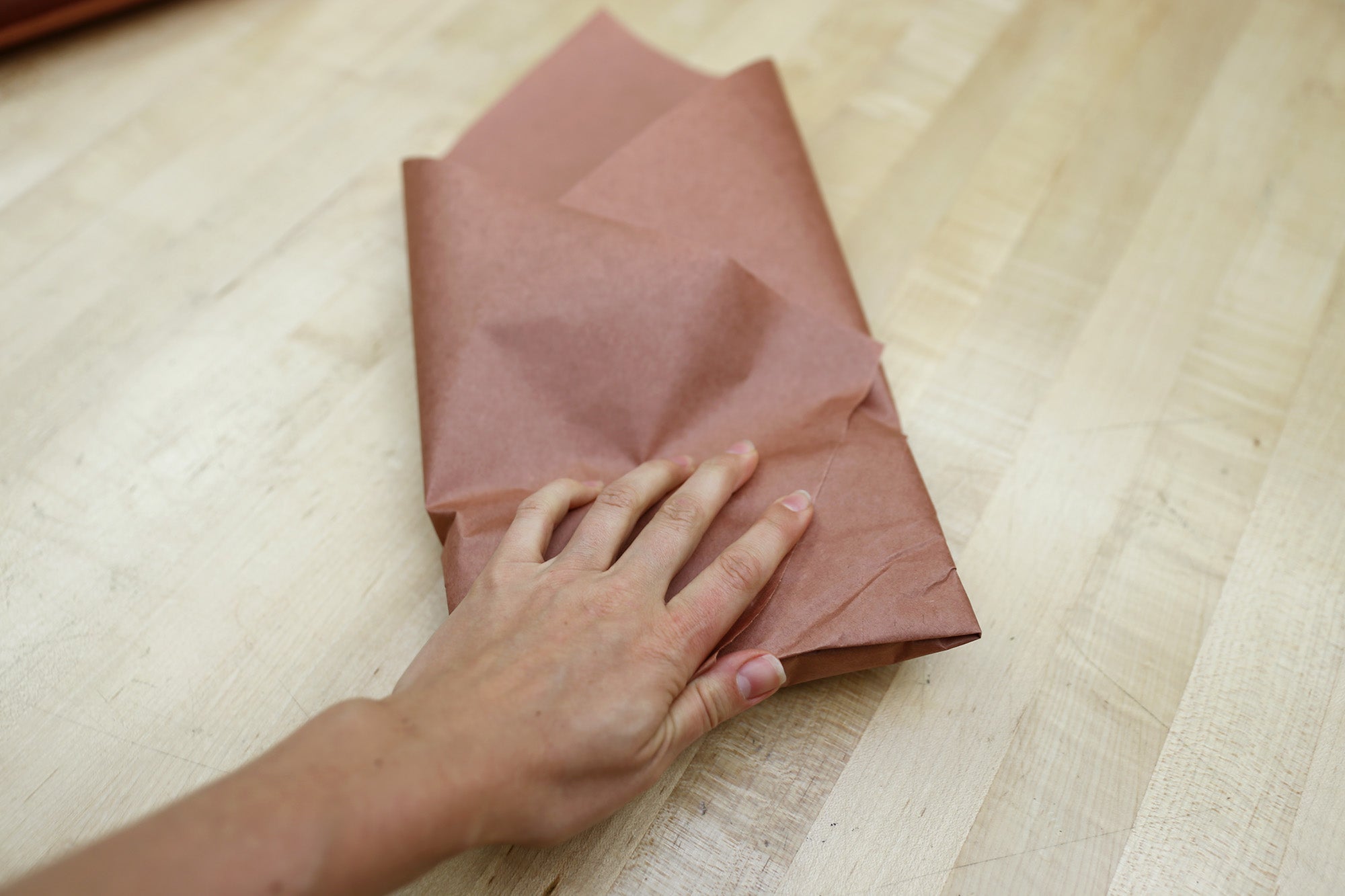 Place the wrapped fillet diagonally in the corner of the paper square and fold up the corner.