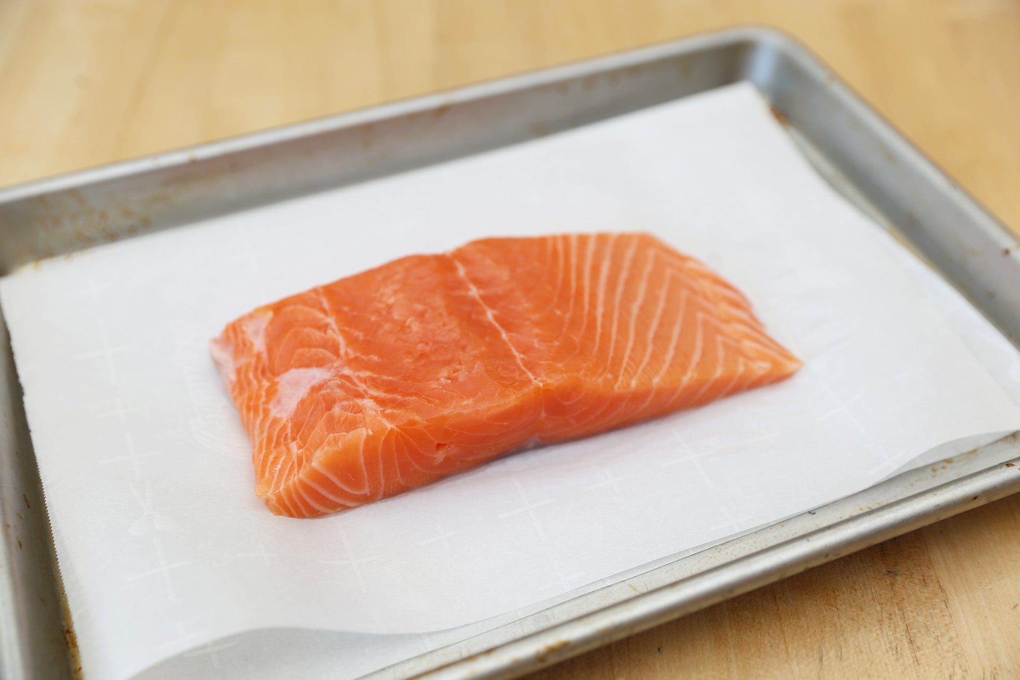 Place the fillets back on the parchment paper, remove any stuck ice cubes, and return to the freezer for a few minutes to allow the first layer of the glaze to freeze. Repeat this process until a visible build up of ice has formed. BE CAREFUL not to crack the glaze while handling the fillets during this process! This would allow air to reach the fish flesh and negate the whole glazing process.