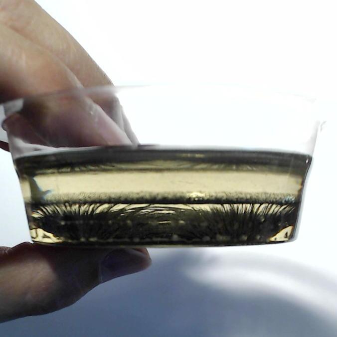 Here, I didn't let the bottom layer cure sufficiently before inserting the magnet. The filings far from the magnet stayed on the boundary with the bottom layer as expected, but the magnet and the filings attached to it sank to the bottom. That wasn't a problem since I used a clear plastic mold; but if I'd removed it from a silicone mold, it would leave the magnet and some filings exposed for people to touch.