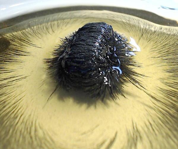 This attempt used a scrap piece of clear plastic as a mold (and I never removed the cast from the plastic). The bar magnet (the same type as used above in the Instructable) was below the mold, so it's not embedded in the acrylic. Because the container is shallow, some of the iron filings stick out of the acrylic in a way that reminds me of ferrofluid.