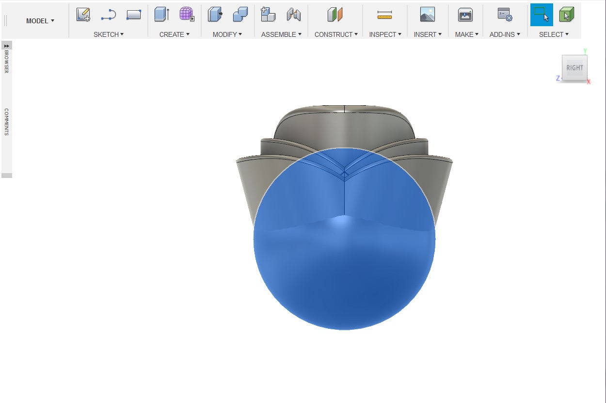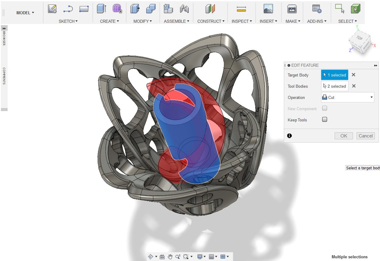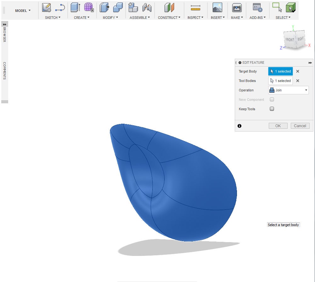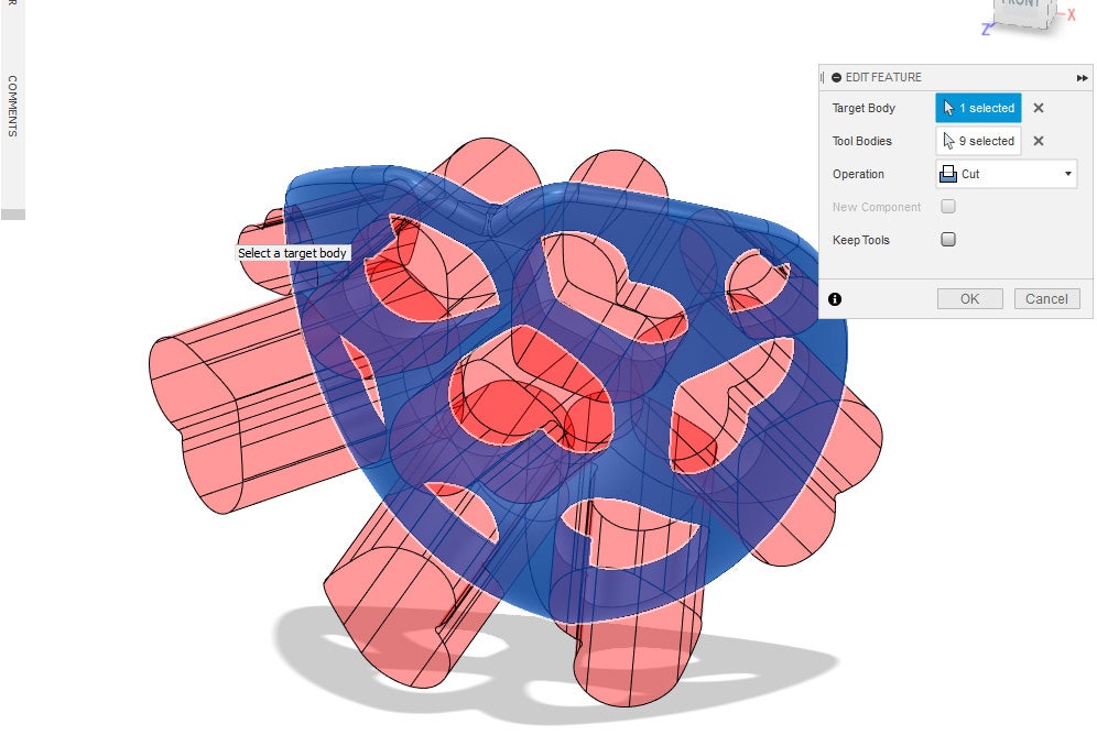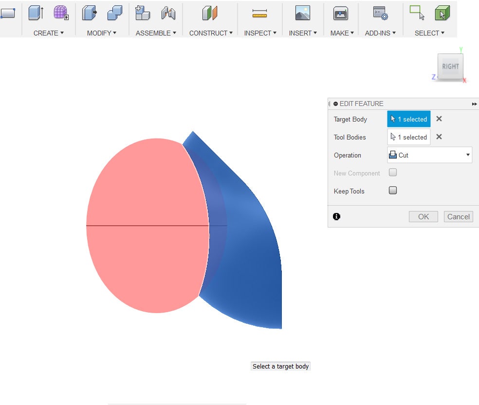 12. Under the Modify Menu, select Combine. Select the old sphere as the target body and the scaled sphere as the tool bodies. Set the operation to cut and then press okay.