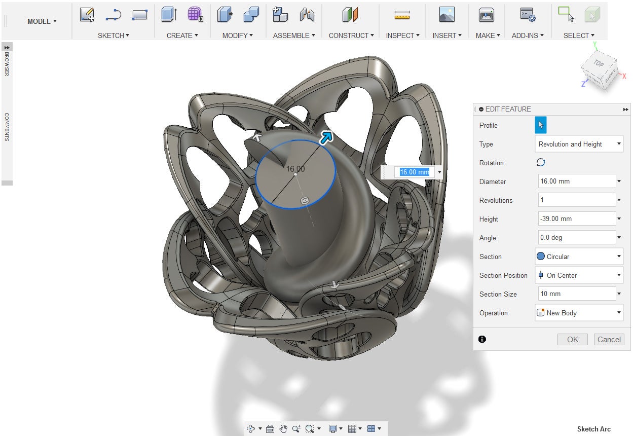 18. With the fillet tool, round the bottom edge of the cylinder. About 6.5mm should work.