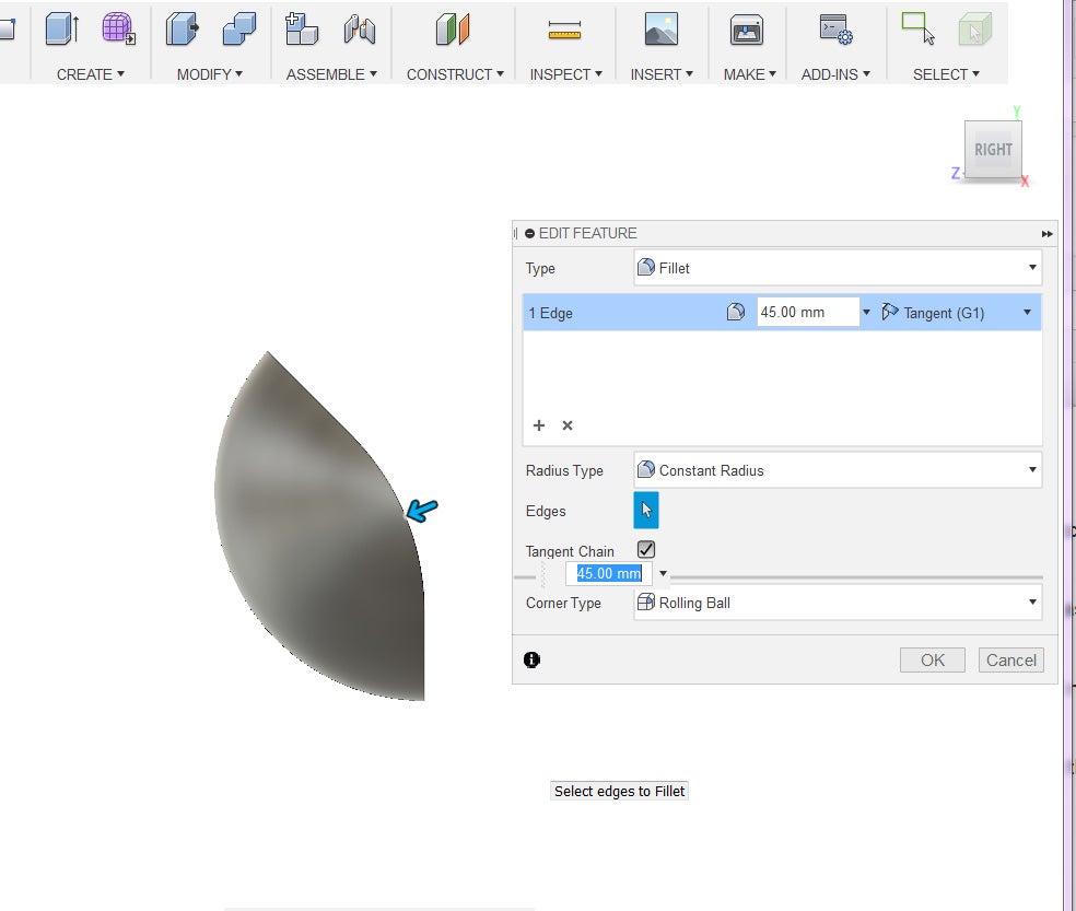 8. Press the F key to bring up the fillet tool. Select the right side corner left by the previous step. Give it about a 45 mm radius.