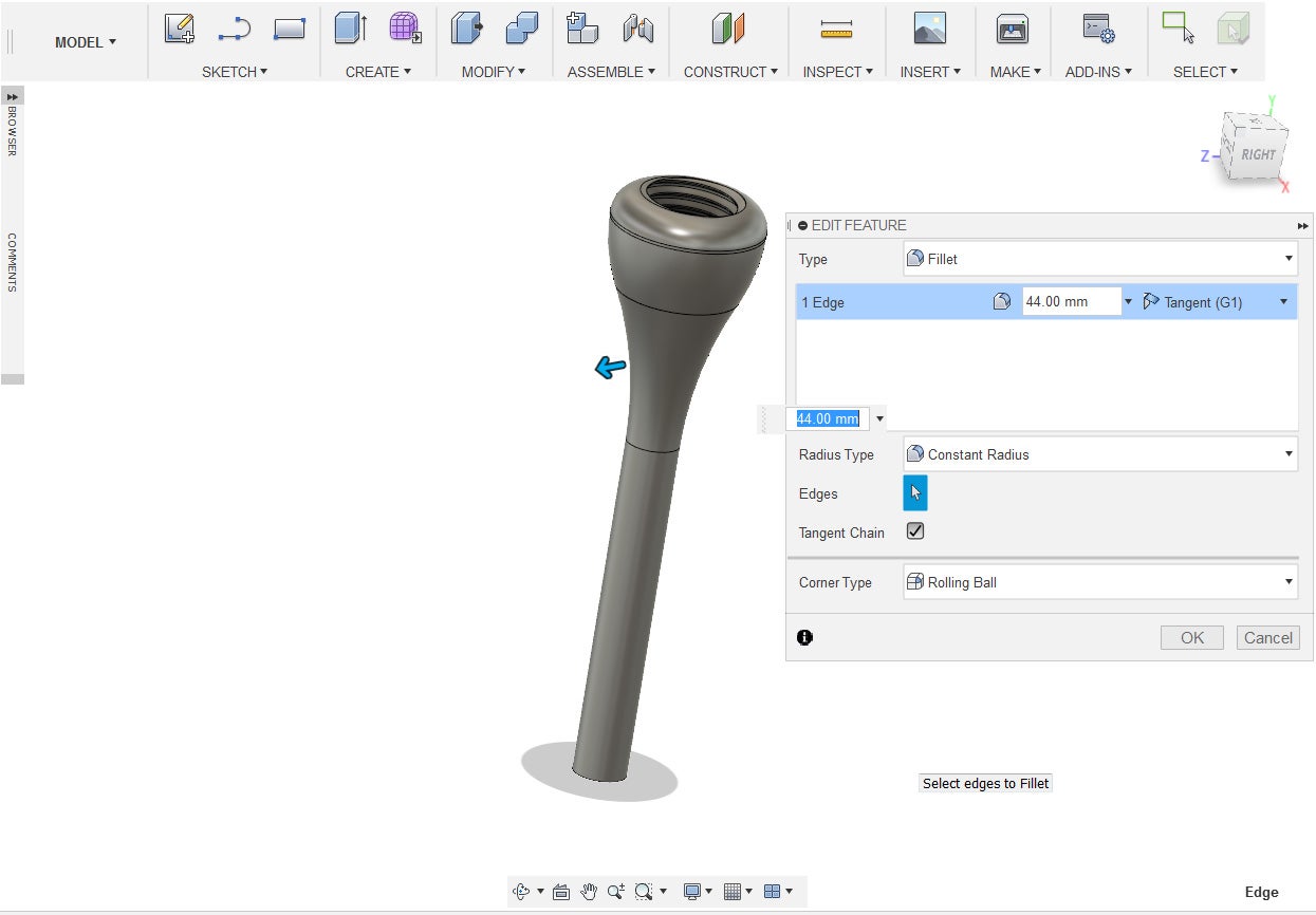 7. Use the fillet tool to round out the top outer edge of the stem.