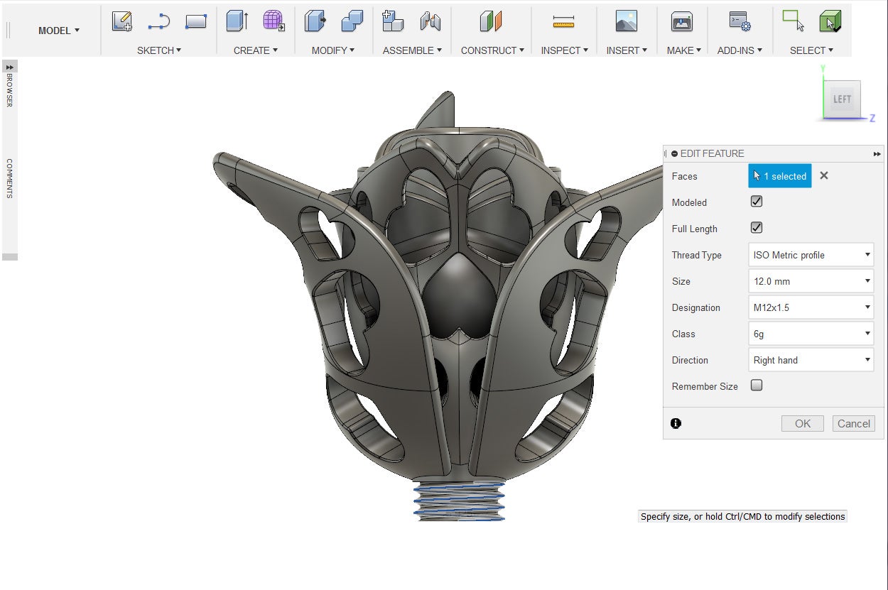 5. Under the Create Menu, select thread. Select the inner walls of the insert cutout. Check on modeled. Use same settings as the the thread for the blossom insert.