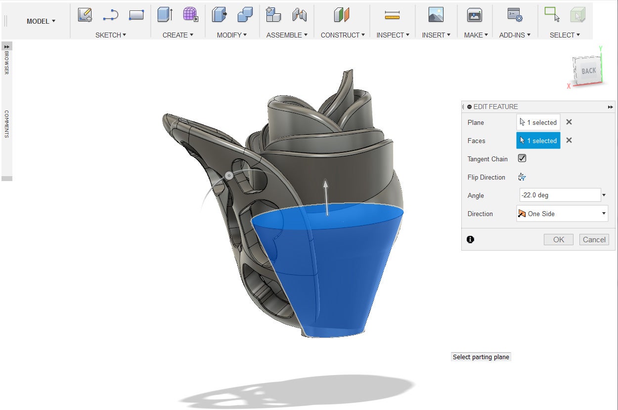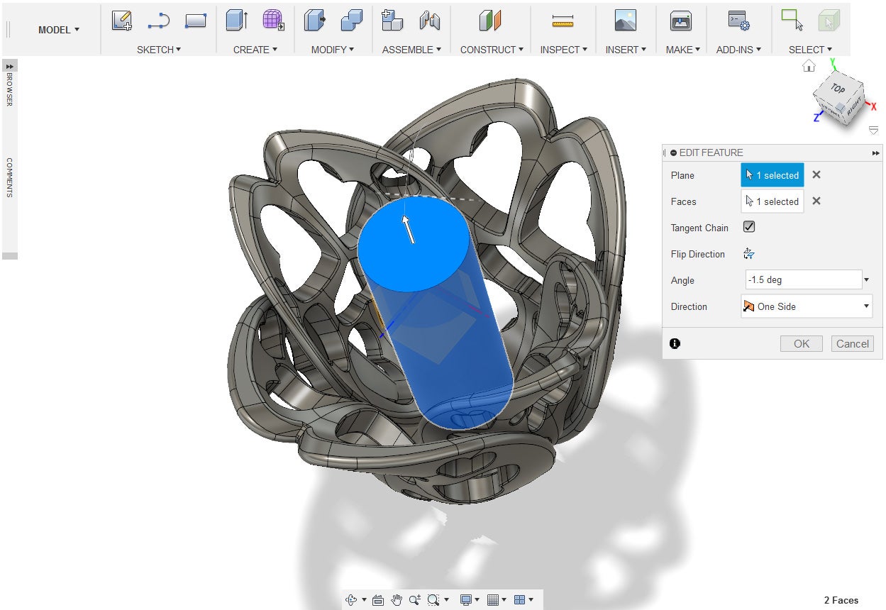 15. Under the Modify Menu, select draft. Select the top face of the cylinder for the plane and the side of the cylinder for the faces. Give the cylinder a -22 degree draft.