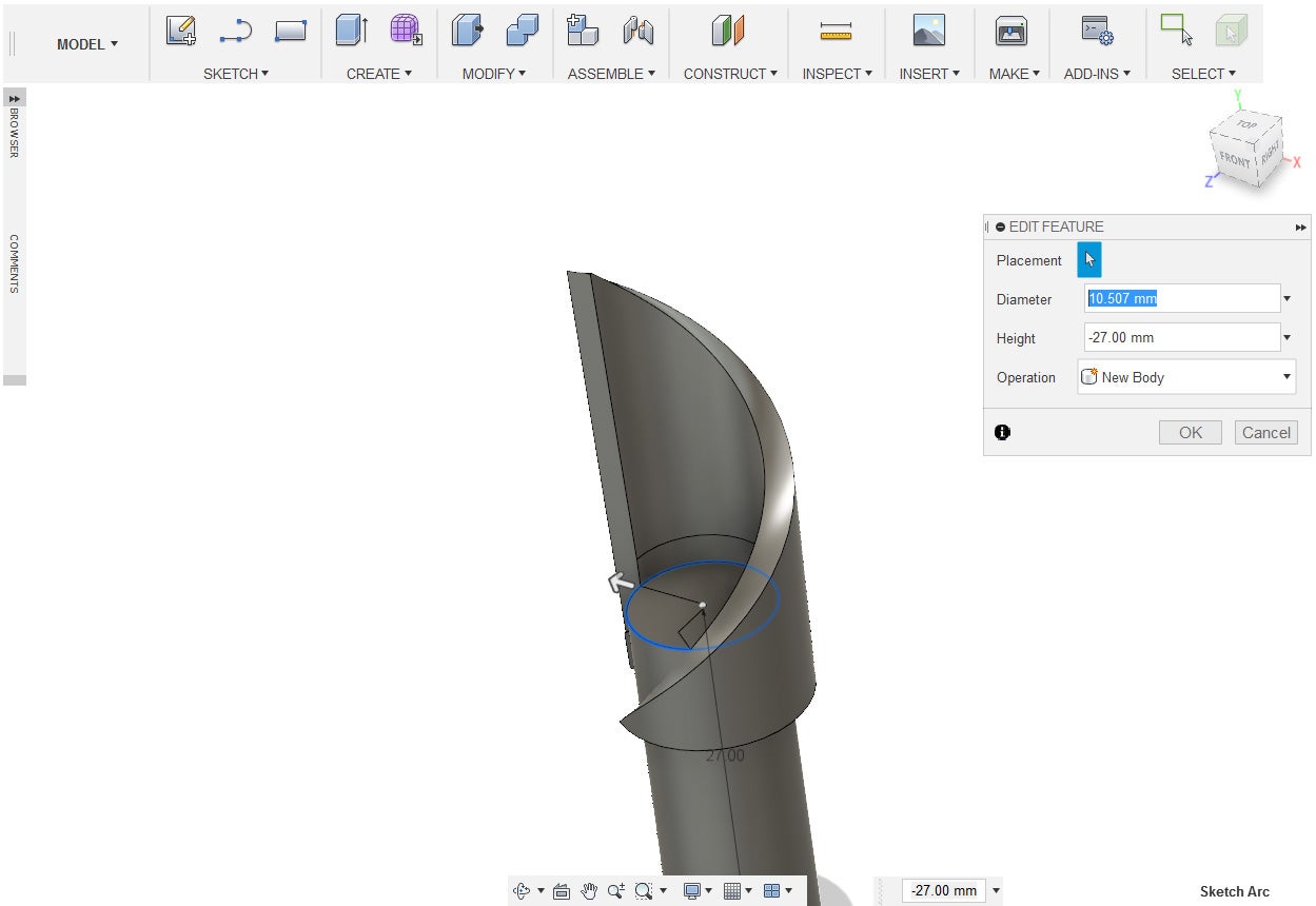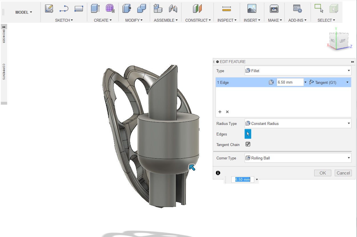 15. Press the F key to bring up the fillet tool. Apply about a 26.5 mm edge.