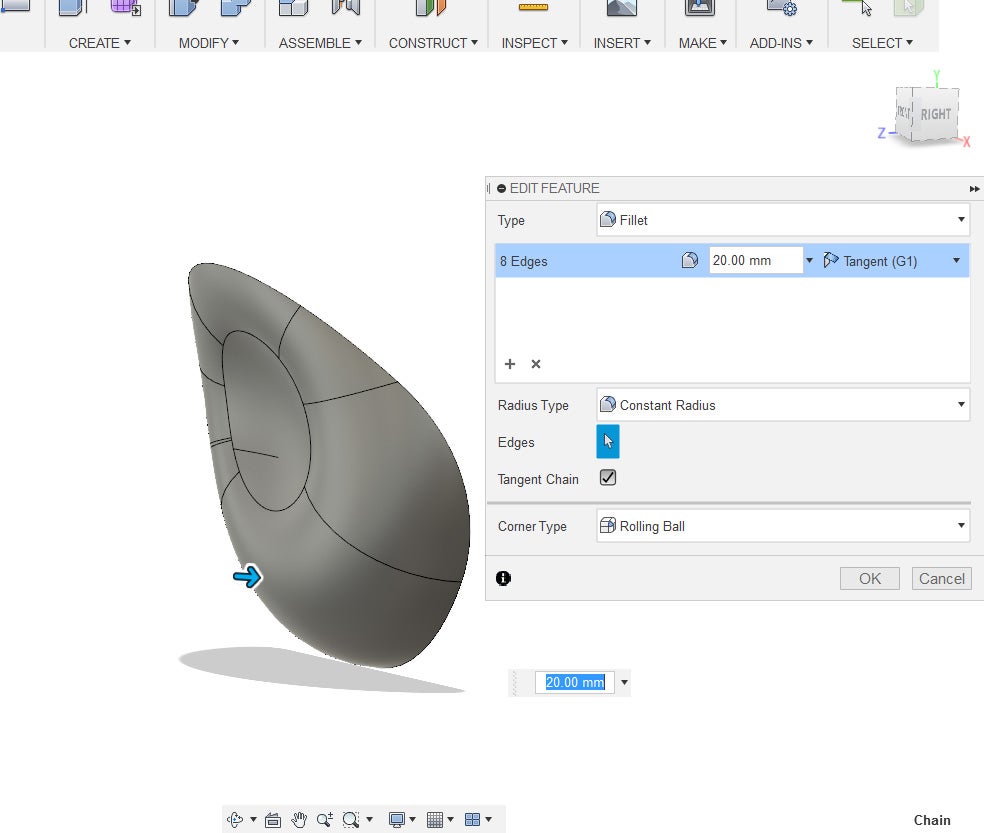 17. Using the fillet tool again, apply a 20mm edge.