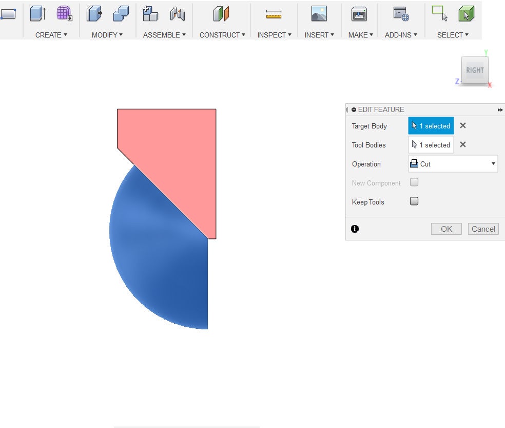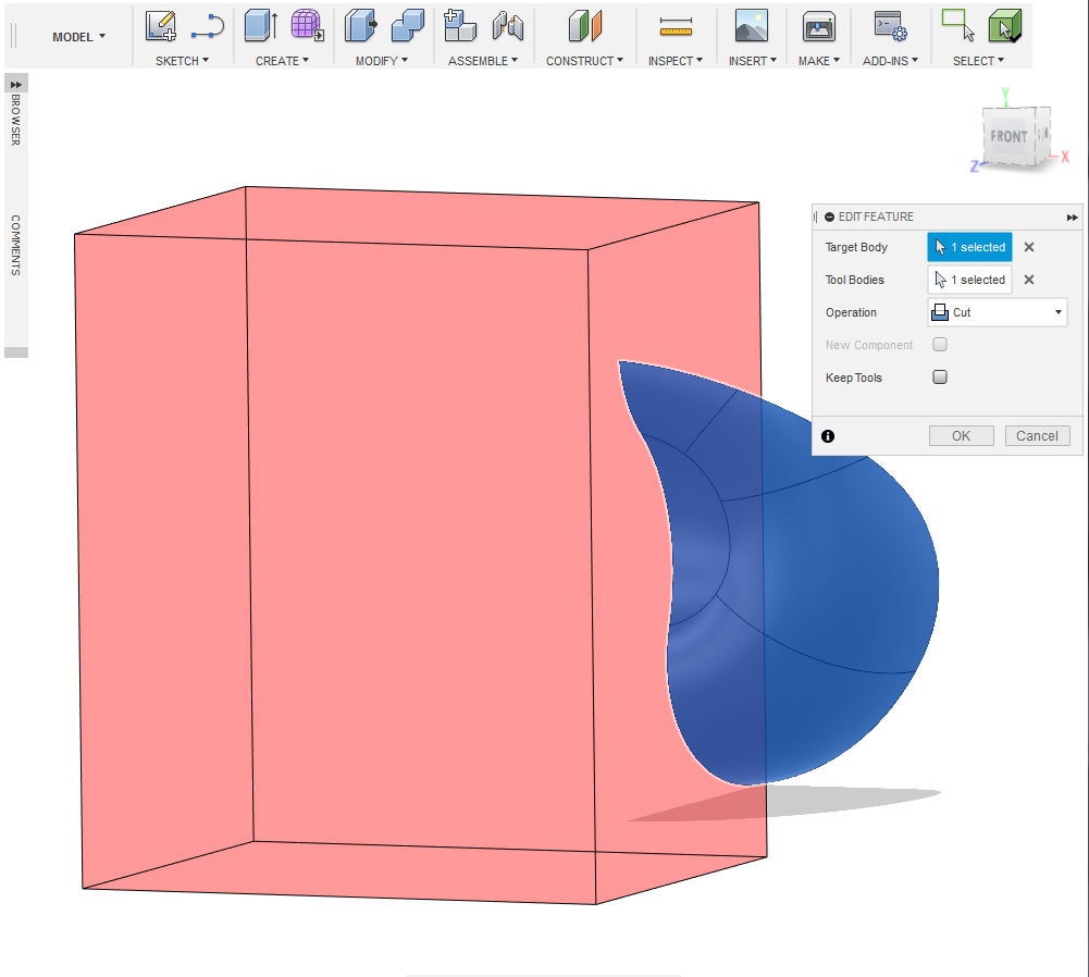 4. Under the Modify Menu, select Combine. Select the Sphere as the target body and the Box as the tool bodies. Set the operation to cut and then press okay.