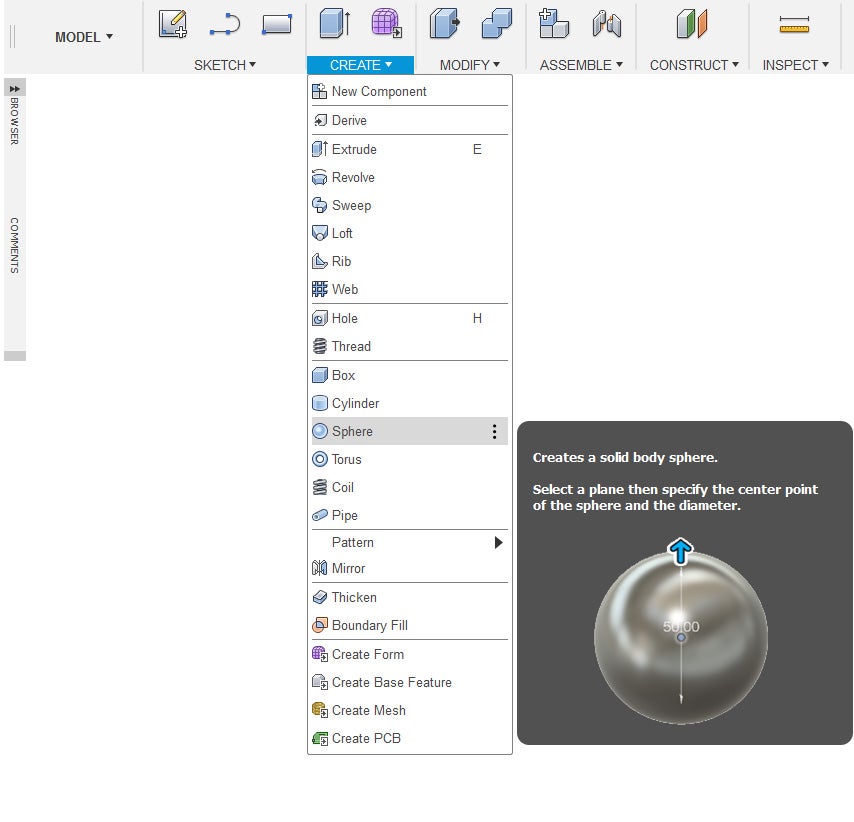 1. Under the Model workspace start by going to the Create Menu, and select sphere.