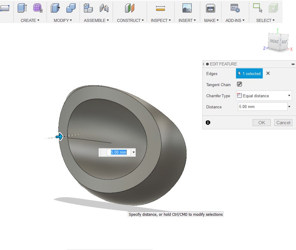 13. Select edge of what was cut. Under the Modify Menu select Chamfer. Give a distance of about 5 mm