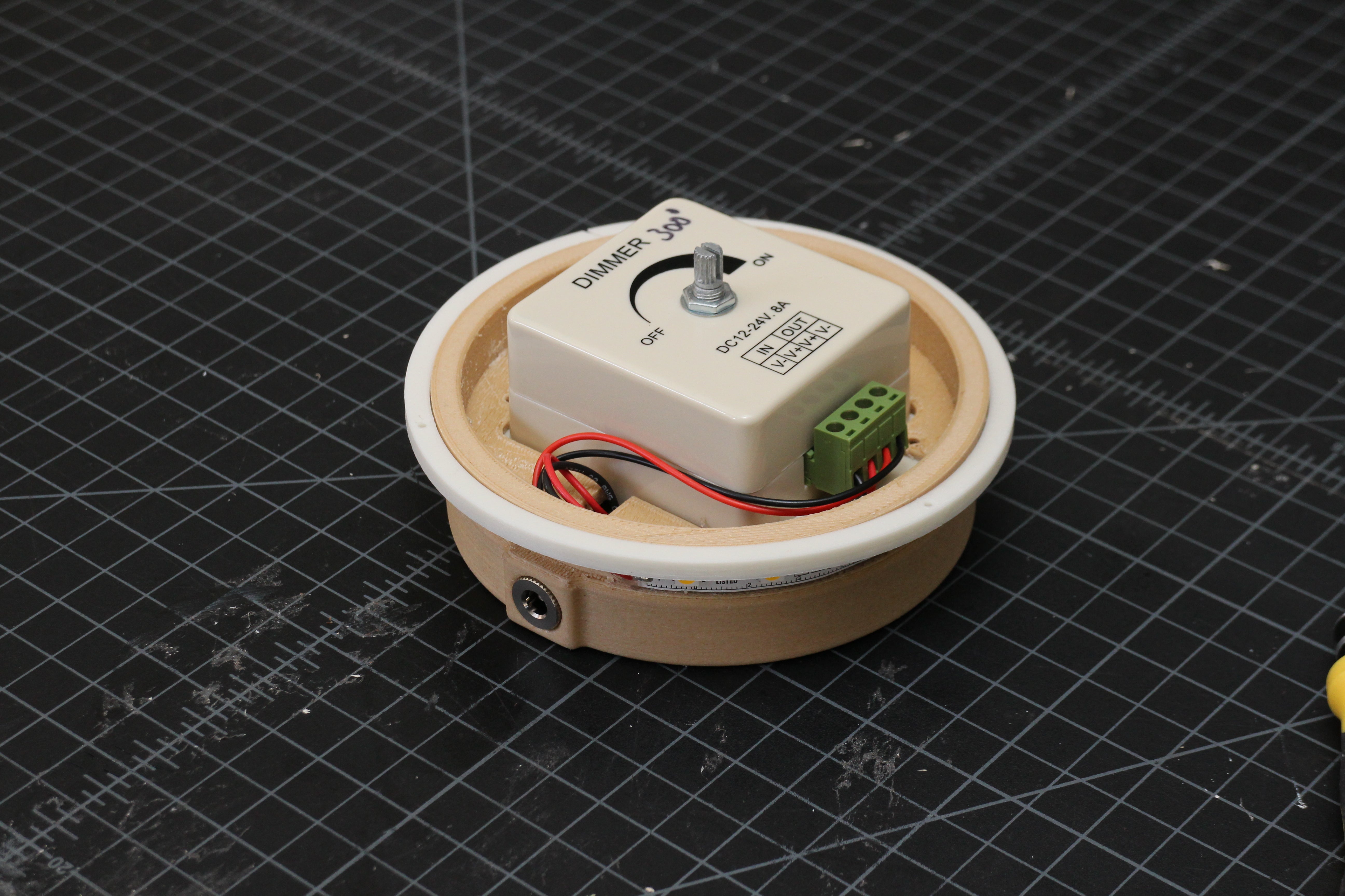 The design is pretty simple, it's a base with a dimmer built in, and a cap that acts as a giant knob. There's a ring on the inside that keep the knob cap in place, and the knob cap plugs into the potentiometer post on the dimmer. With the base stationary, twisting the knob cap turns the potentiometer and dims the LEDs.
