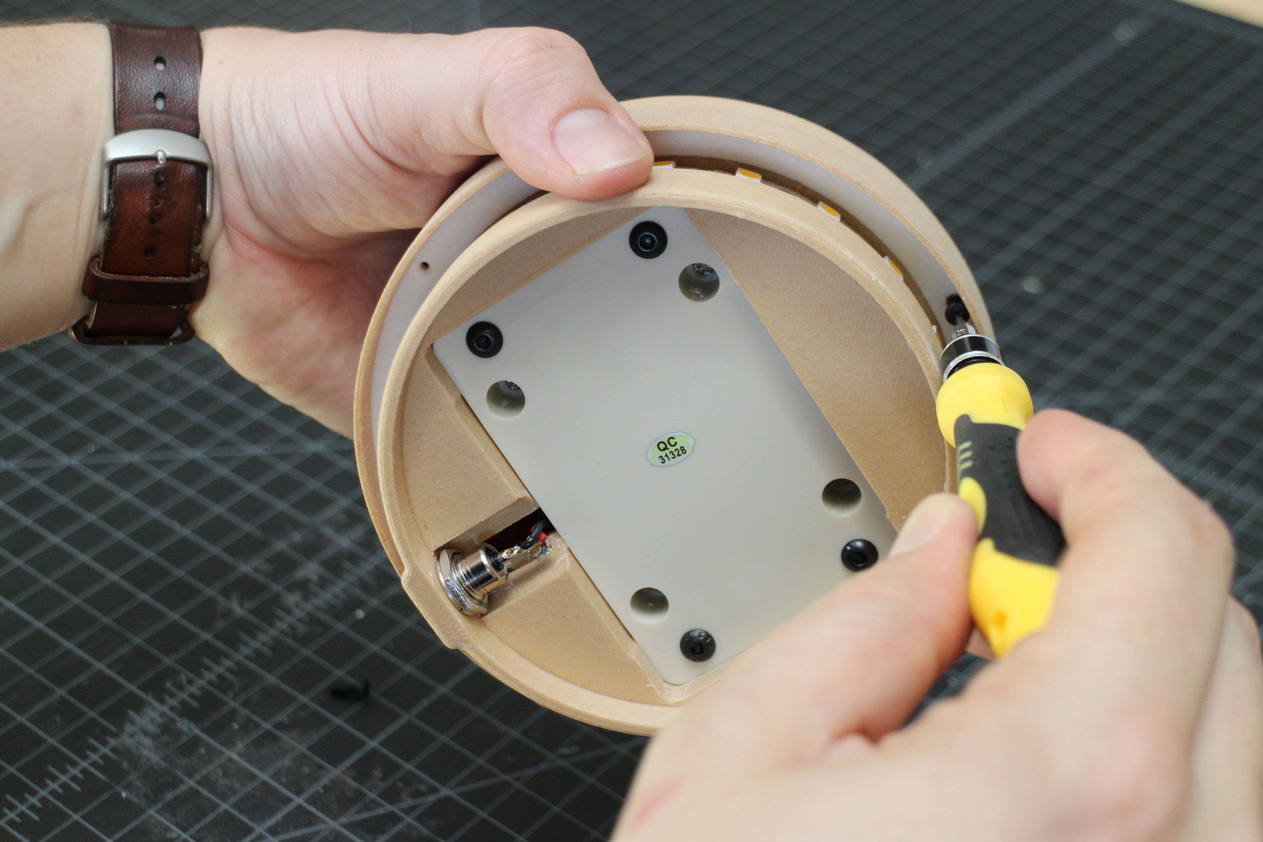 4. Push the dimmer into the hole in the bottom of the base, then use the M4 screws to fasten it in place.