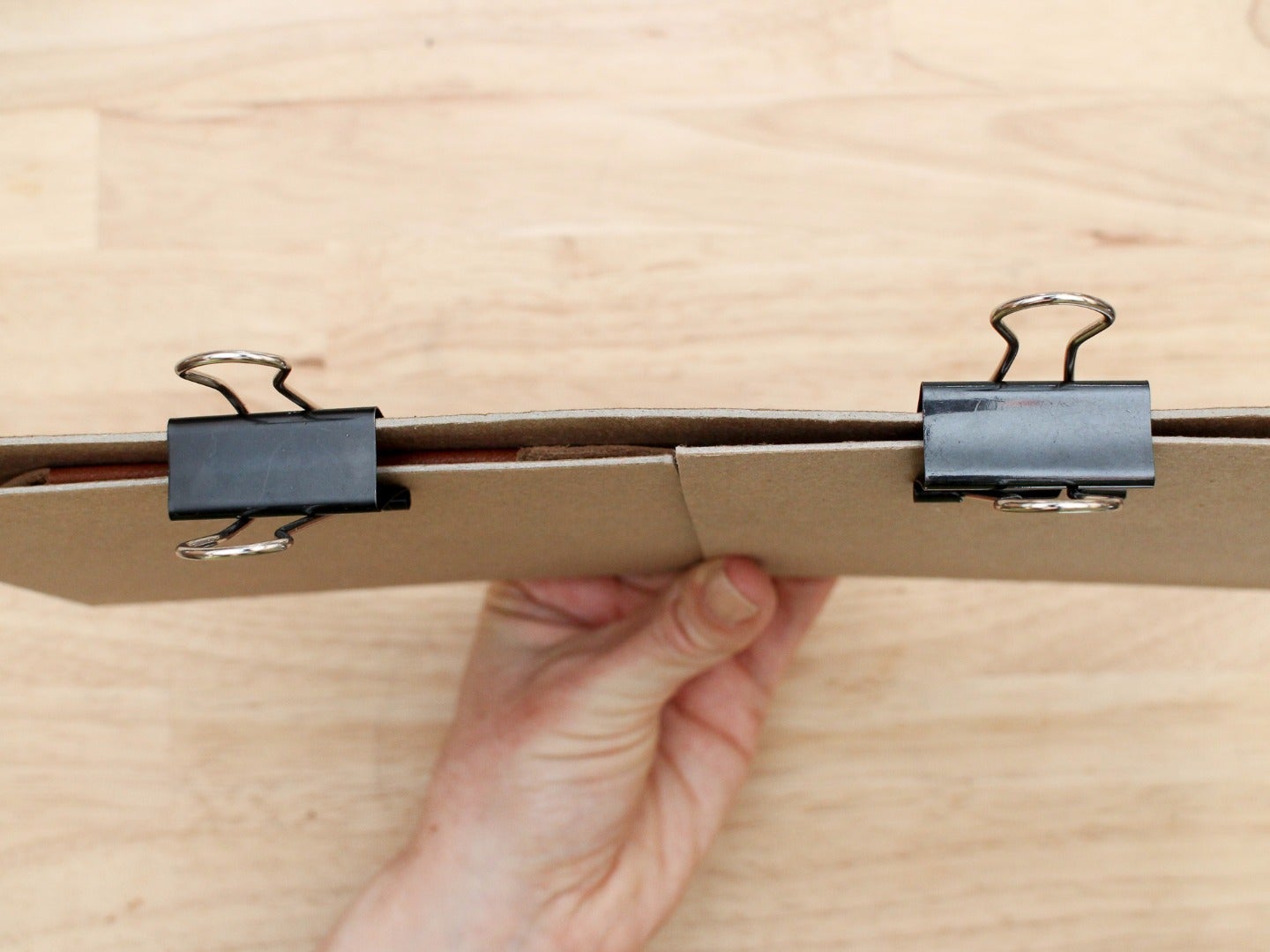 If you have a moment to leave your wallet sitting before moving to the next step, you can help solidify the fold by clamping it between two pieces of cardboard with binder clips. Leaving the wallet clamped like this until it dries in a few hours will make the folds lay extra flat, but it isn't absolutely necessary.