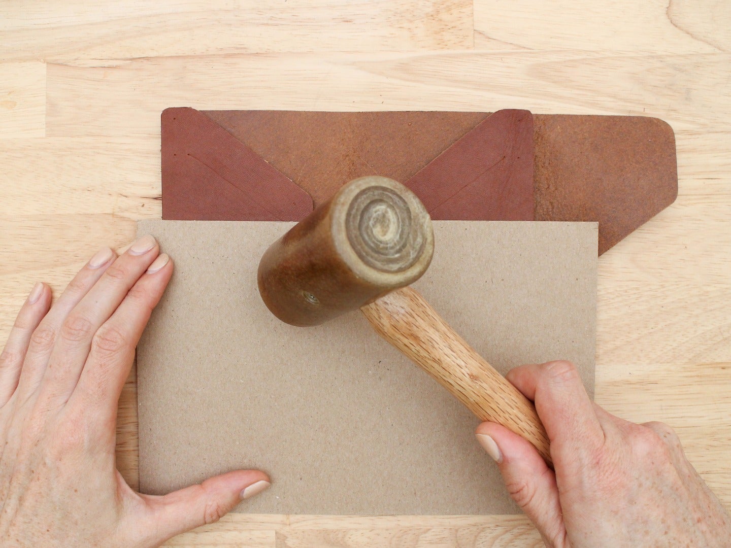 Now you need to help define a permanent crease along this line by pounding the fold with a mallet. Using a mallet to crease leather is basically the leatherworking equivalent of using an iron to press fabric during sewing. To prevent the mallet from making marks in your leather as you pound, take some scrap pieces of stiff cardboard or leather and place them over the fold. Pound hard on top of the cardboard until you have formed a good crease in the leather.