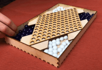 The design includes storage for the marbles and a lasercut lid. I designed it using Fusion360 for the grid, arrows and supports and MakerCase for the box.