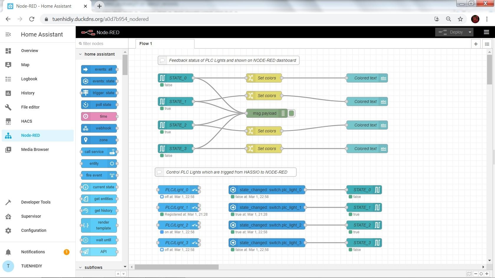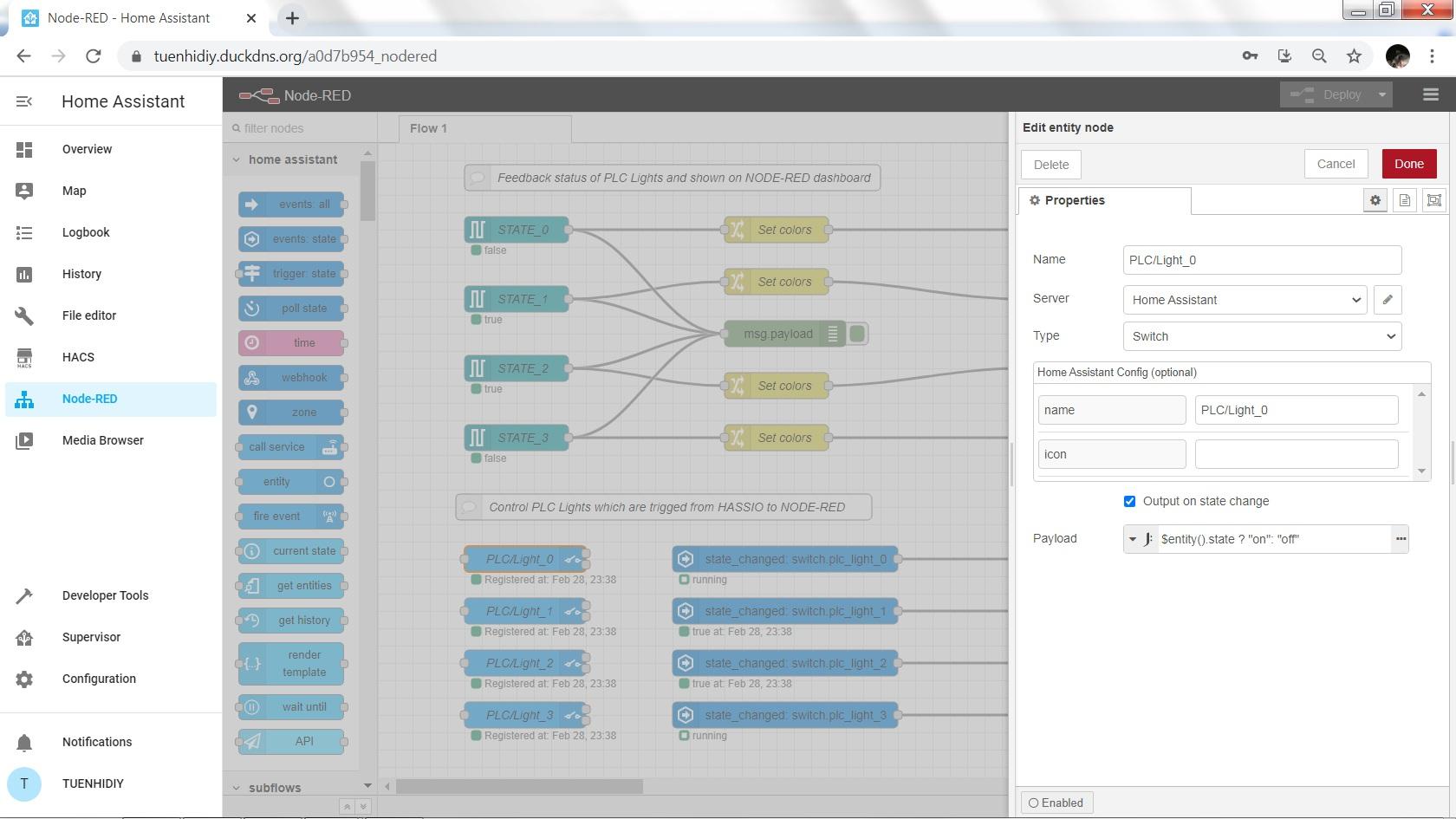 In order for the PLC Lights to be controlled by Home Assistant, I used the node-red-contrib-home-assistant-websocket extension to generate the switch entities from Node-RED.