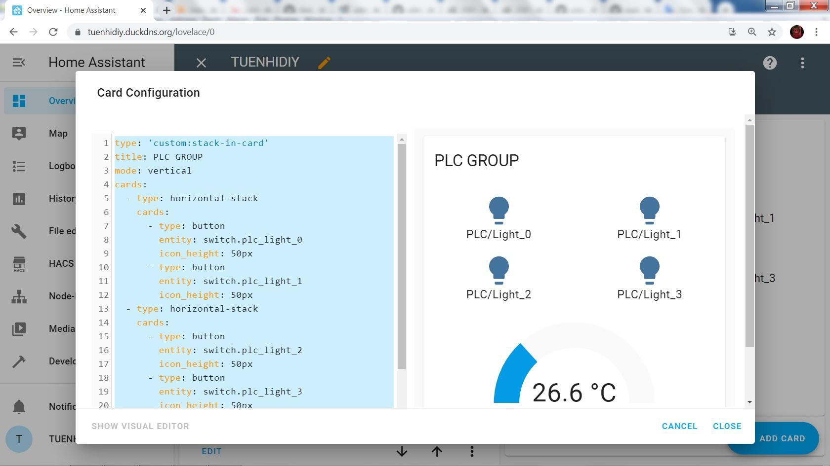 Home Assistant did not support to add gauge card and button card into one group, so I had to do following steps to create PLC GROUP: