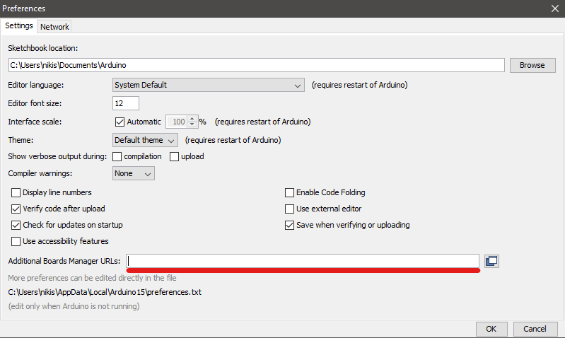Next, you need to open your Arduino preferences (File>Preferences) and add http://arduino.esp8266.com/stable/package_esp8266com_index.json.