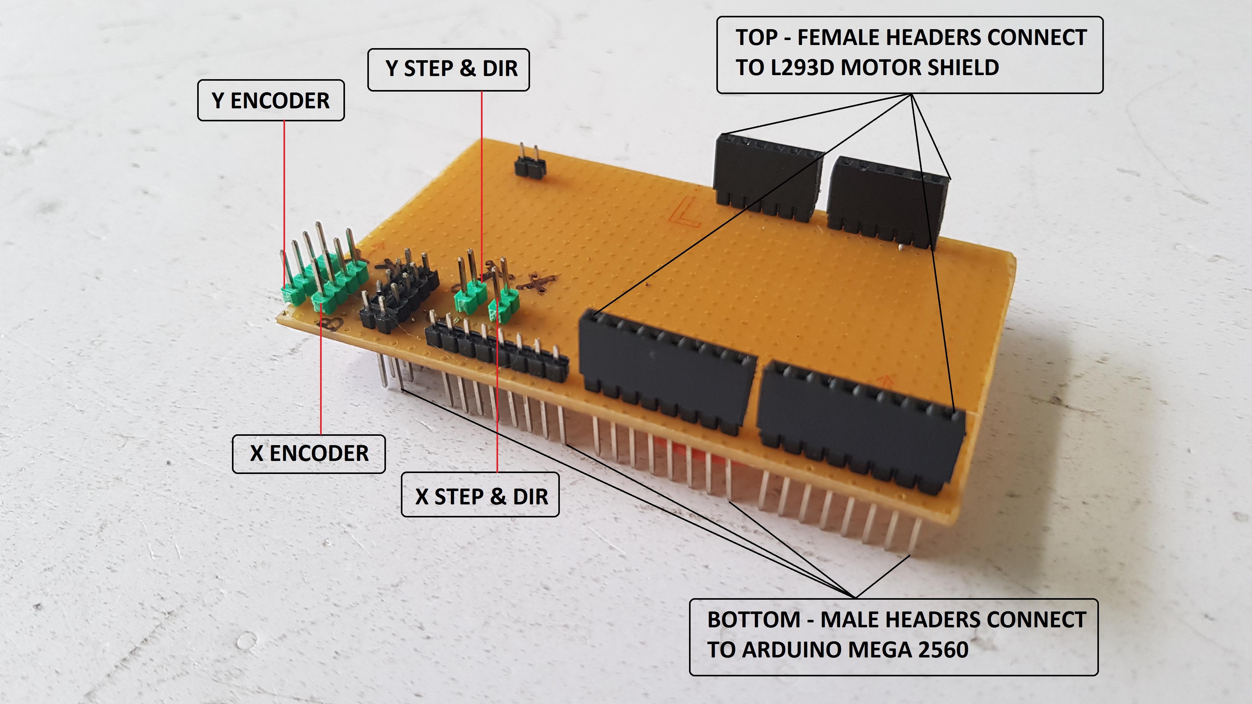 Following the schematic on STEP 2, I cut one PCB prototype board size 60 x 90mm and soldered all the wires connections. Adapter Shield is used for connecting the Arduino Mega 2560 to the L293D Motor Shield, DC servo motor encoders and control signals from GRBL firmware (STEP & DIRECTION) as follow: