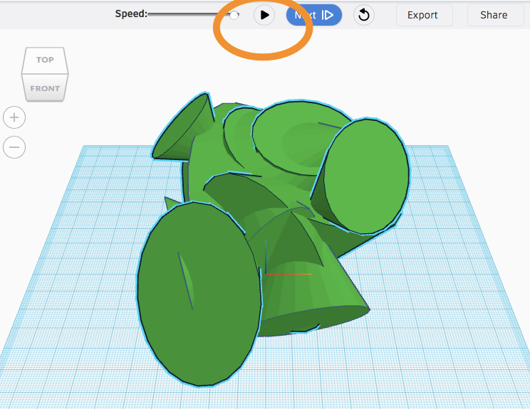 For more instant gratification, your students could also make GIF recordings of their Code-CAD creations. This can be done inside the Tinkercad editor by hitting the Share button and then choosing to "Save Gif" in the next screen. Make sure you run it first in the editor. (Note: It takes a few minutes for your GIF to package and download. Totally worth the wait!)