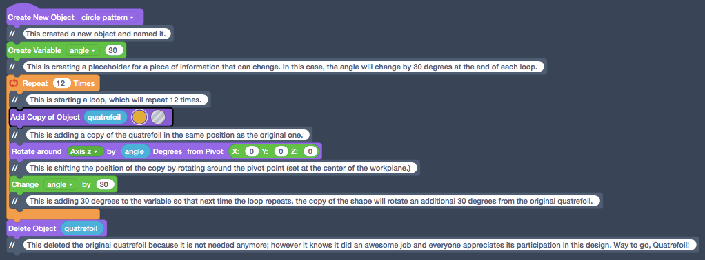 Depending on the enjoyment level that you are sensing from students in your request that they write code comments to explain what is happening during each Step of the design, you might loosen up with the block-by-block directive and just ask that they write at least one comment at the end of the script to show their thinking about how circular patterns are made. (HINT: Hour of Code is supposed to be fun.)