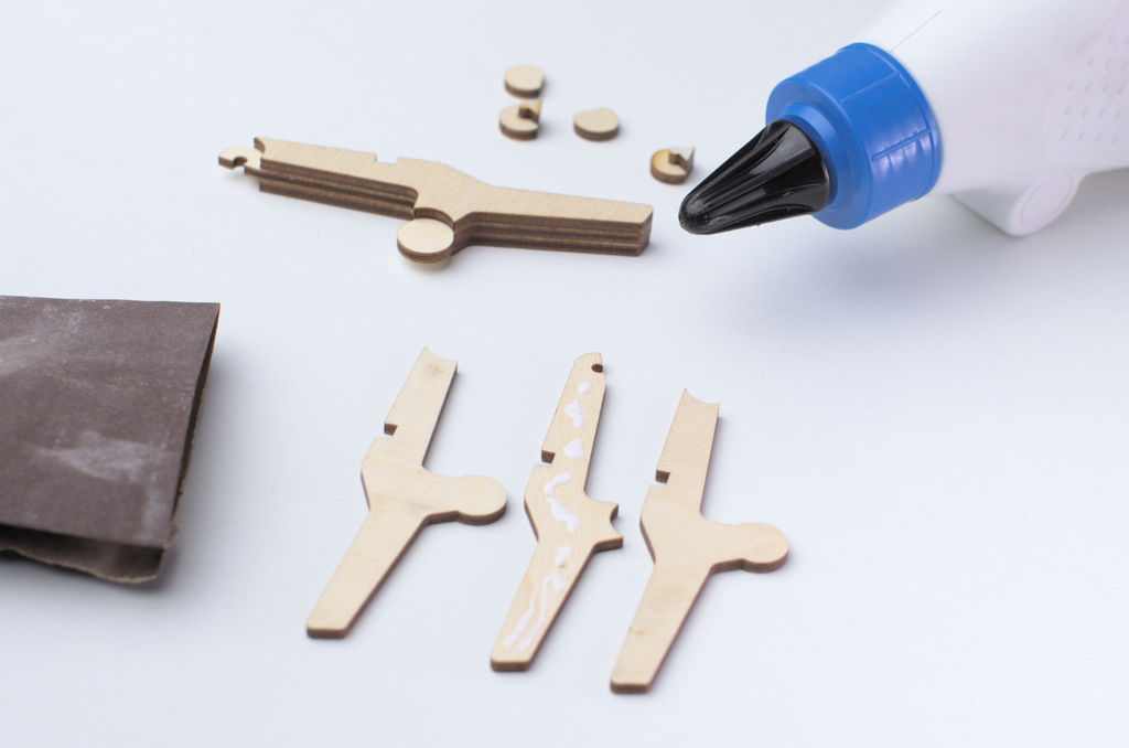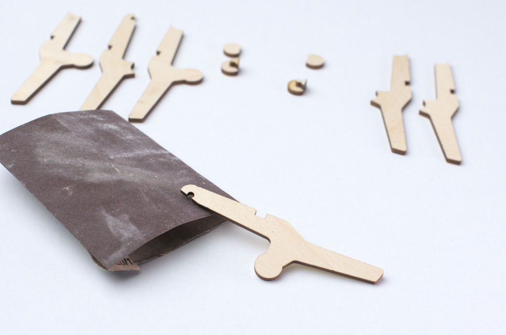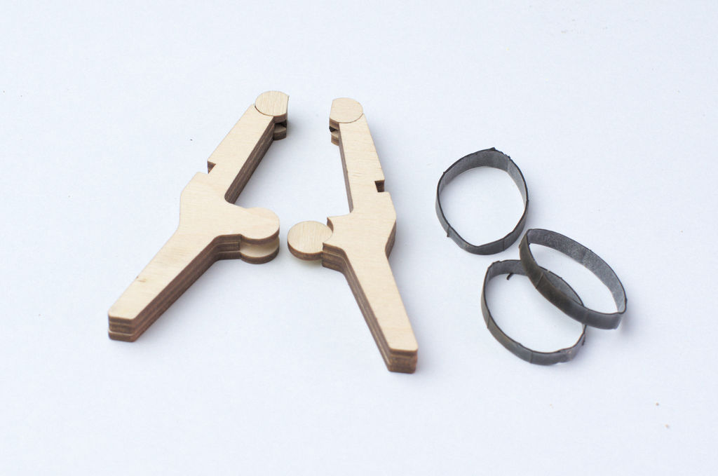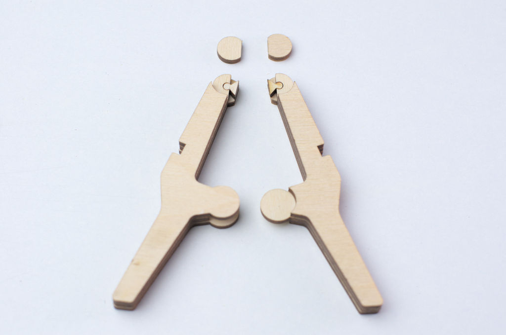 I cut all the parts on a laser cutter at my local maker space. Each clamp is made out of twelve parts: three parts each for the left and right main body of the clamp and three parts each for the jaw pads.
