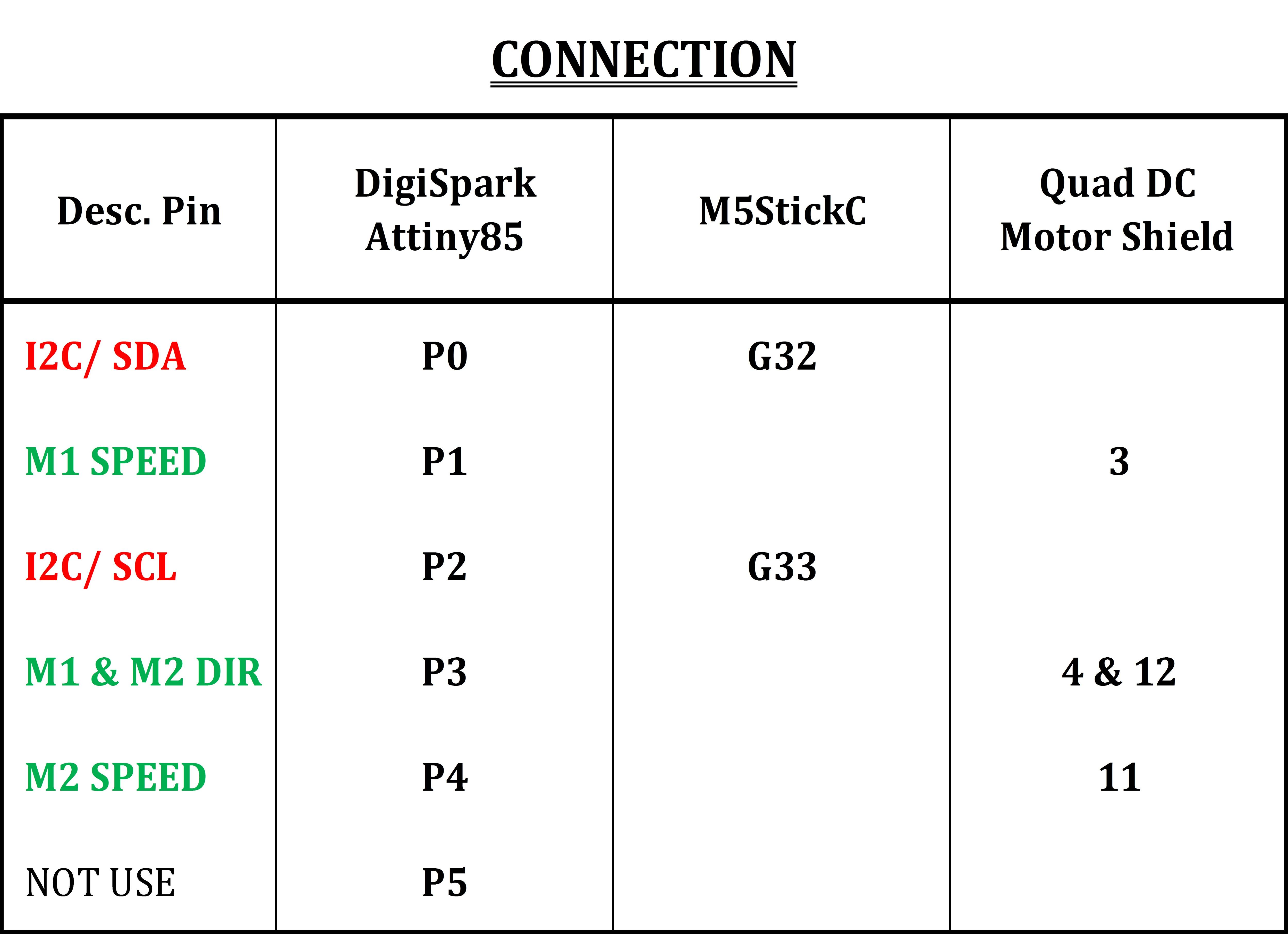 Main control components include: M5StickC, DigiSpark Attiny85, DFRobot Quad DC Motor Driver Shield for Arduino. And their connection is as below: