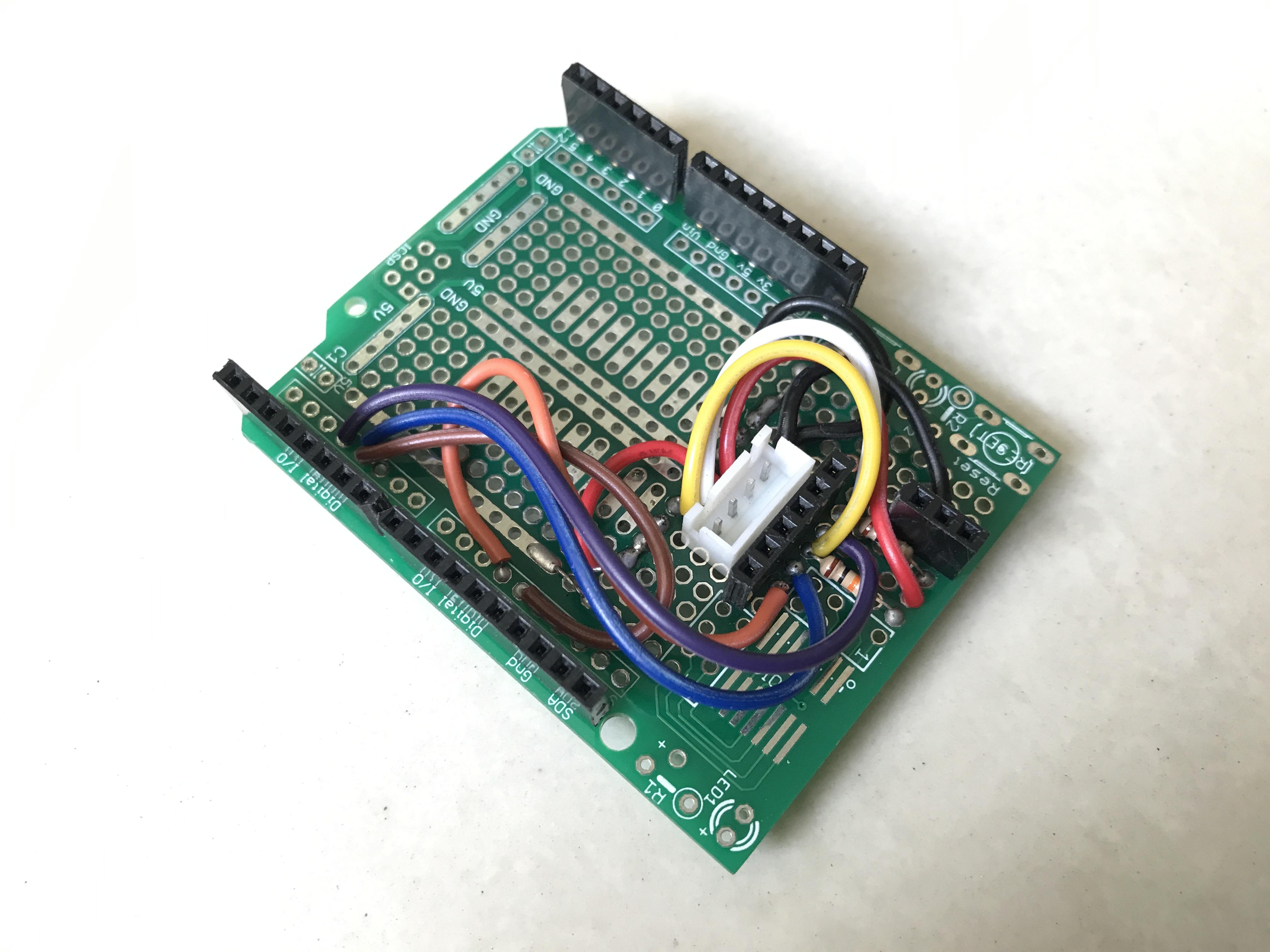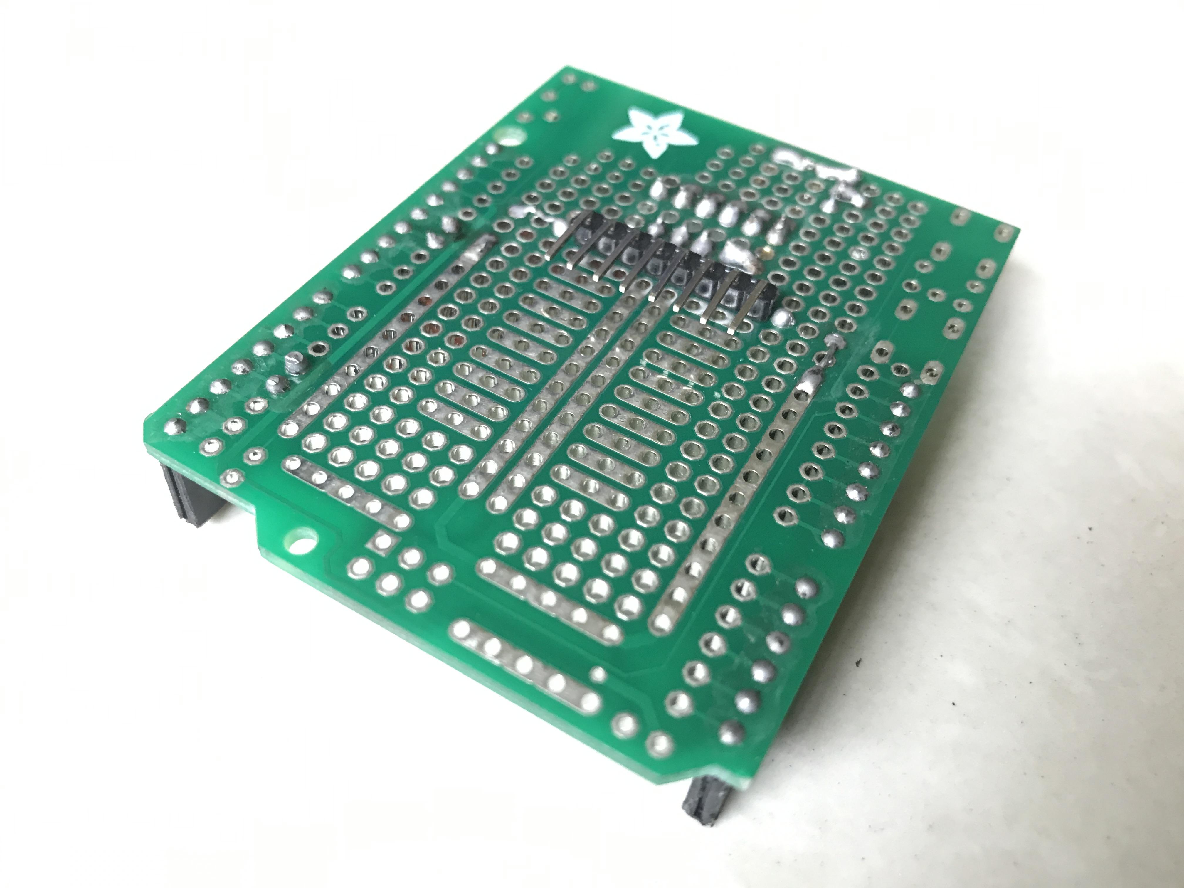 The main control circuit was soldered on an Arduino protoshield following the schematic on previous step, as follow: