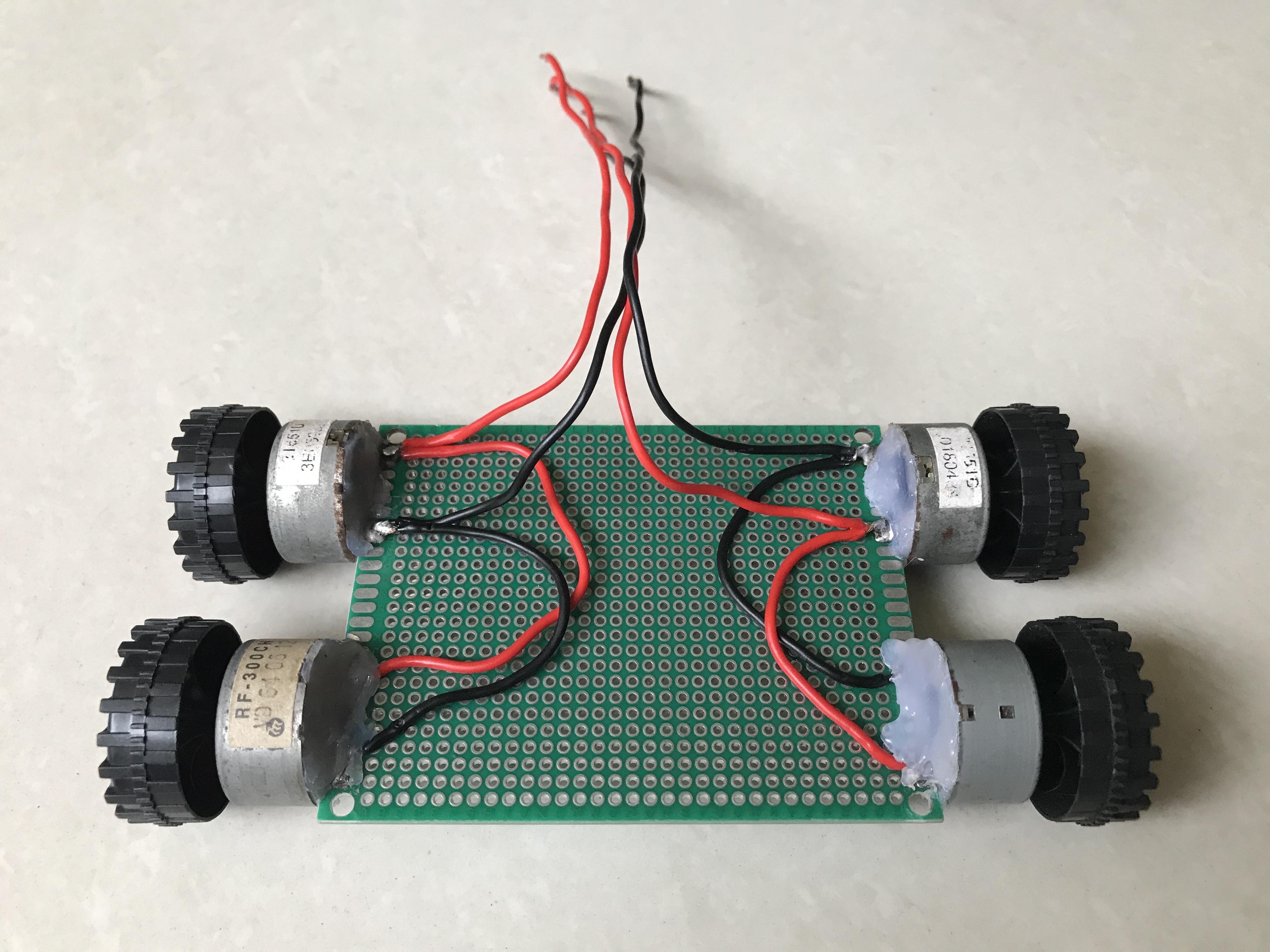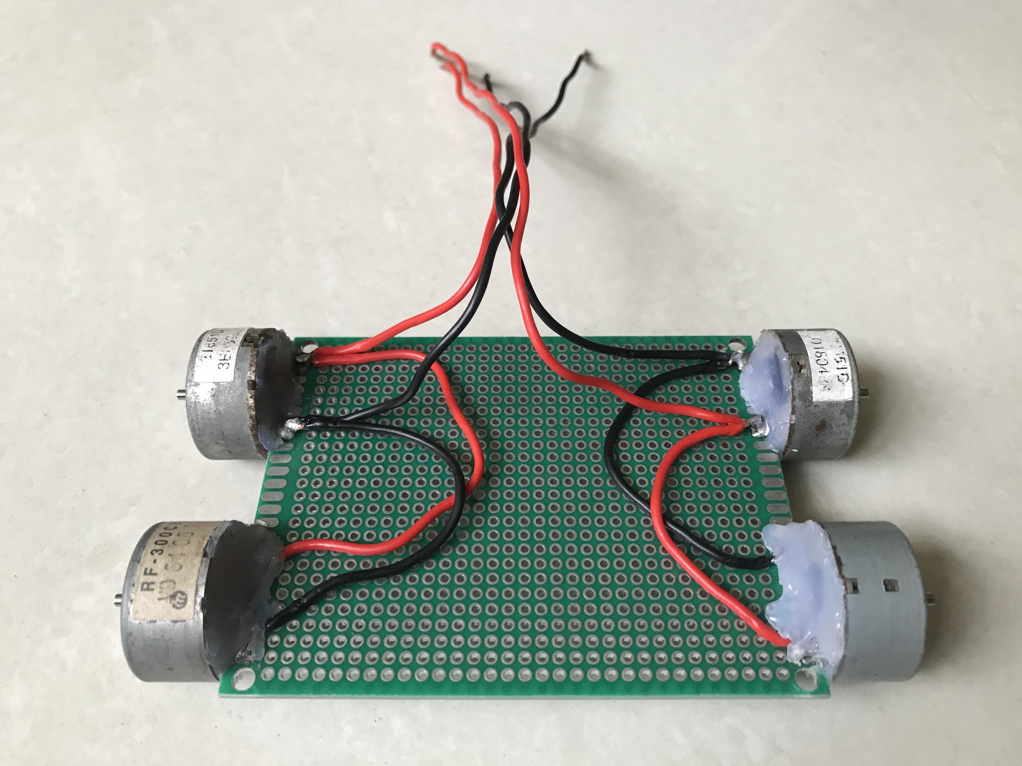 I disassembled four DC motors, soldered them on the double sided protoboard 7x9cm.