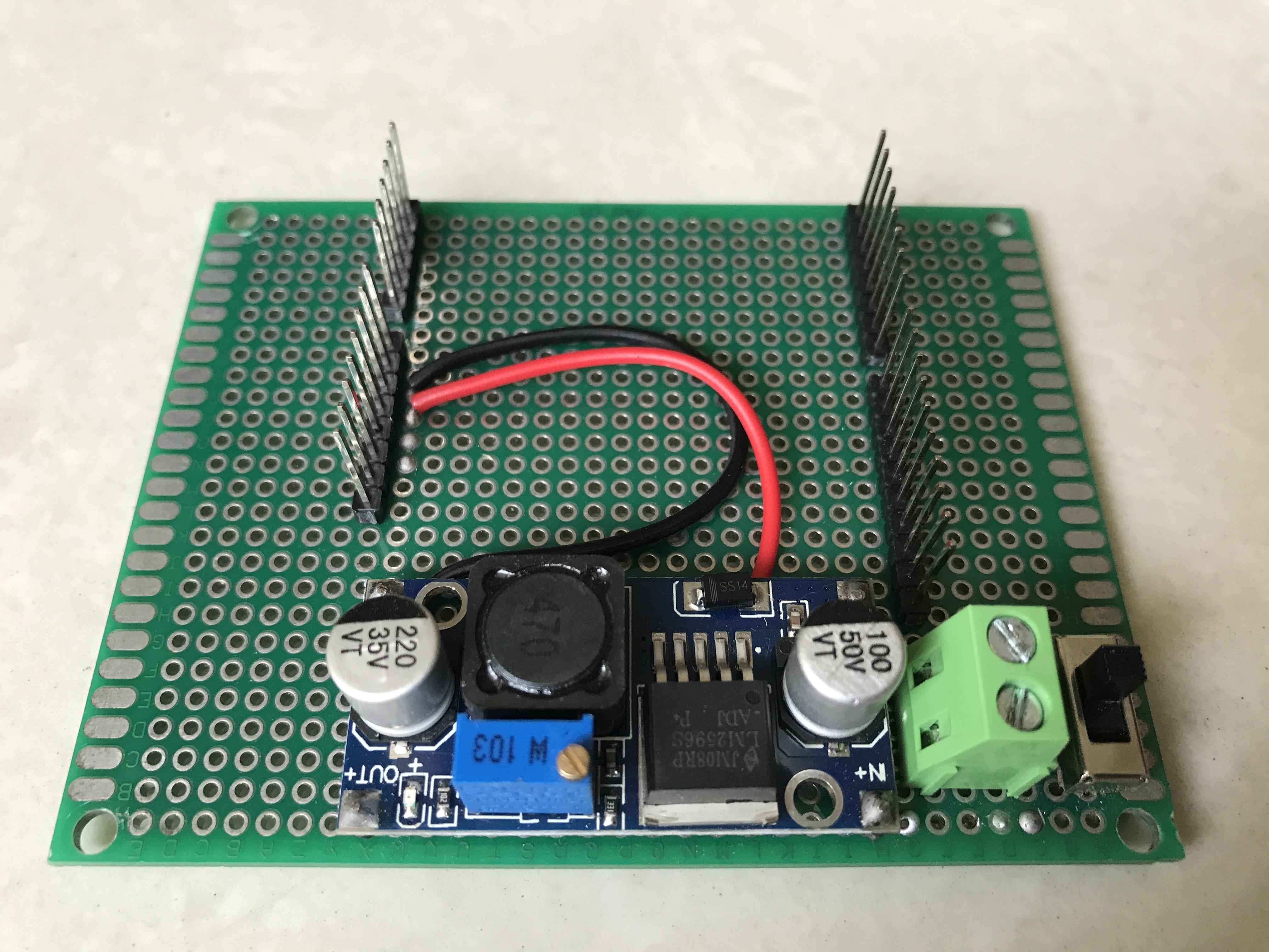 The LM2596 output terminals were connected to male headers at pin 5V and GND. It is used to power all the control circuits after I stack all the boards on these headers.