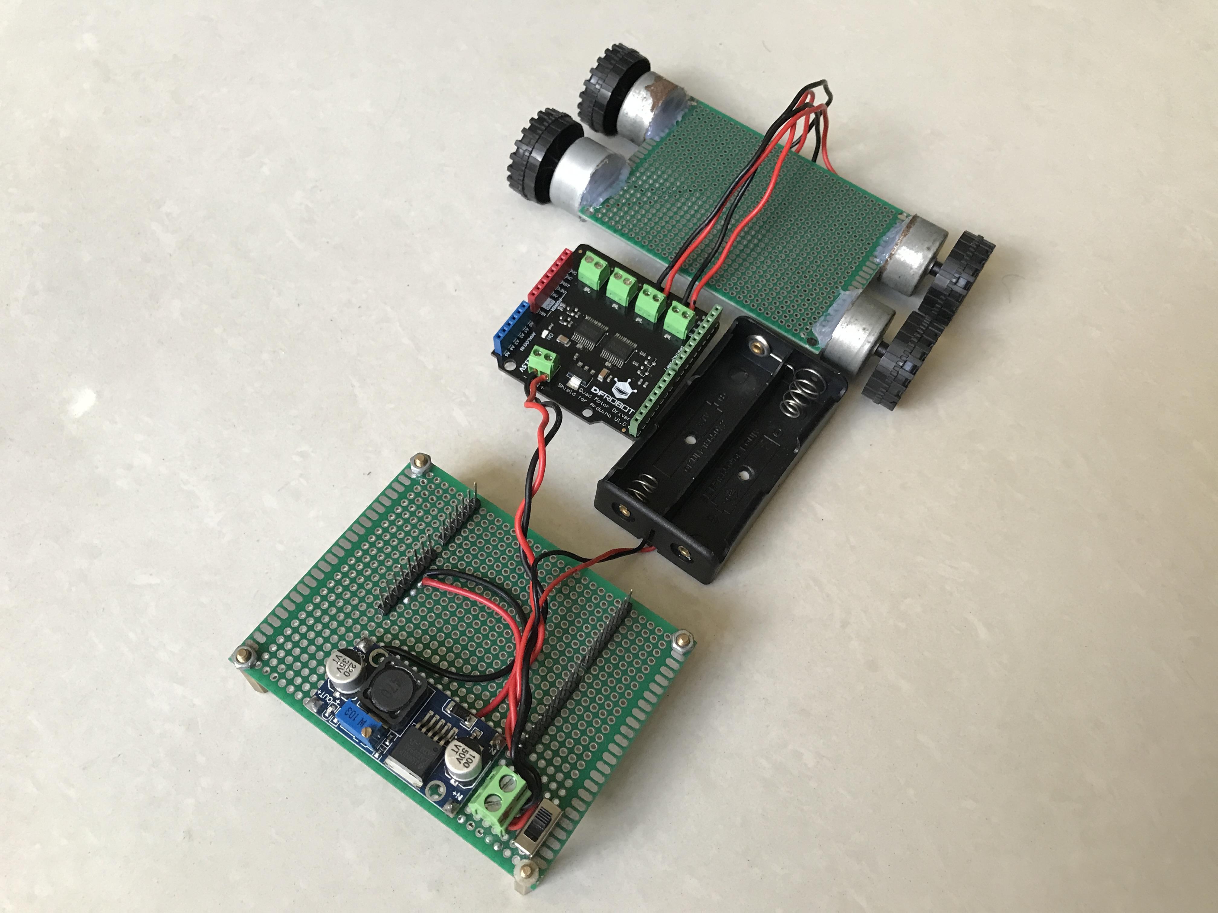 I used another protoboard 7x9cm then soldered on it a step-down power supply module LM2596, a power switch, a 2-pin screw header and 4 male header groups that match correspondingly to all the pins of the Quad DC Motor Shield for Arduino.