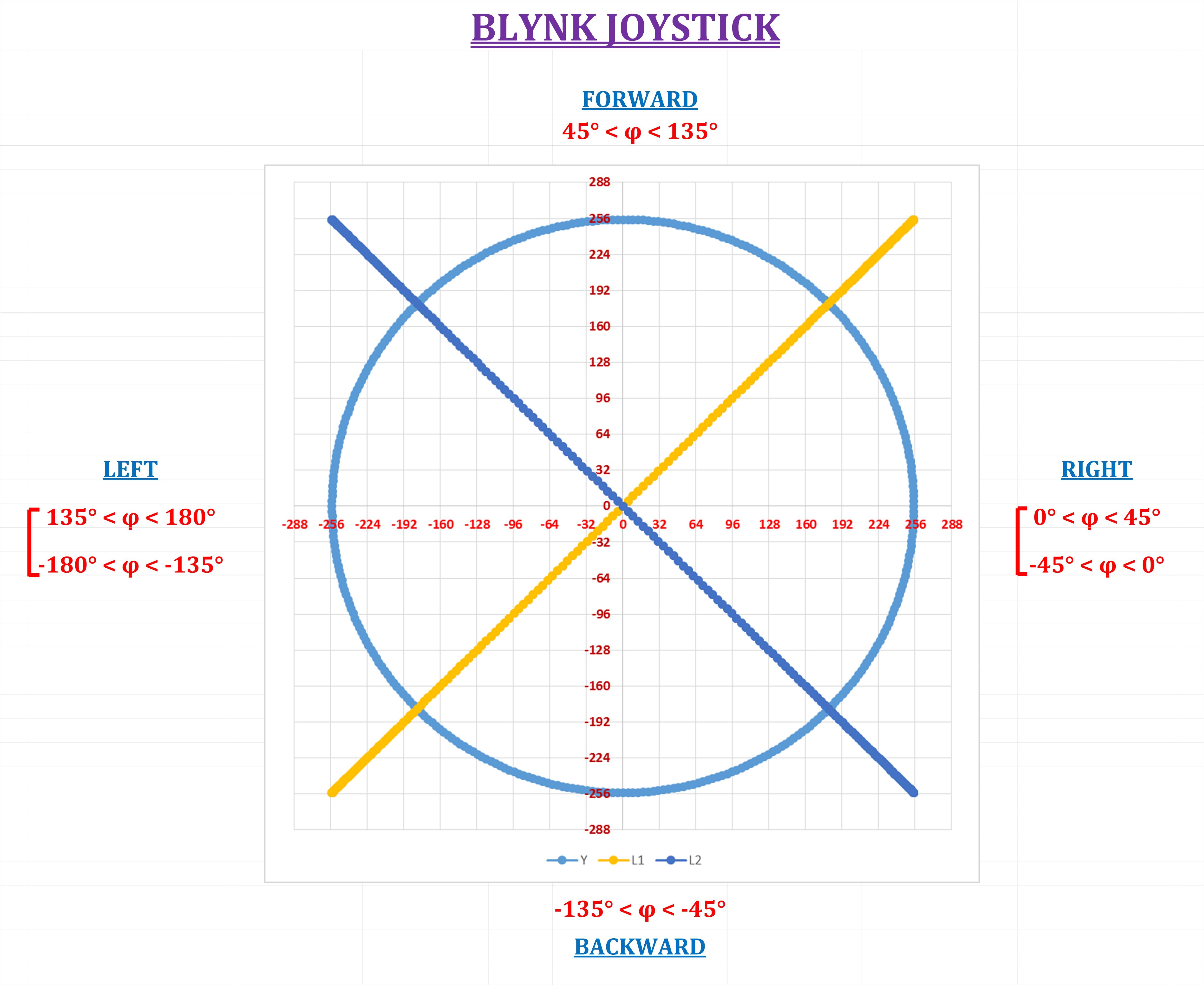 The Blynk joystick cartesian coordinates (x, y) can be converted to polar coordinates (r, φ) with r ≥ 0 and φ in the interval [−π, π] by: