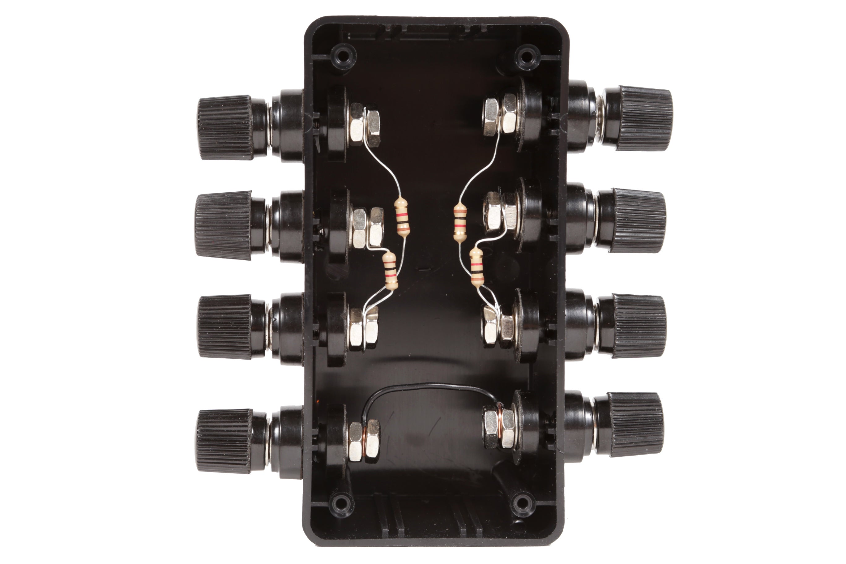 Consider the simplest stereo audio mixer we made earlier that consisted of just four resistors. Imagine the whole thing was placed inside of a black project box, and there were input and output terminals that let us access parts of the circuit.