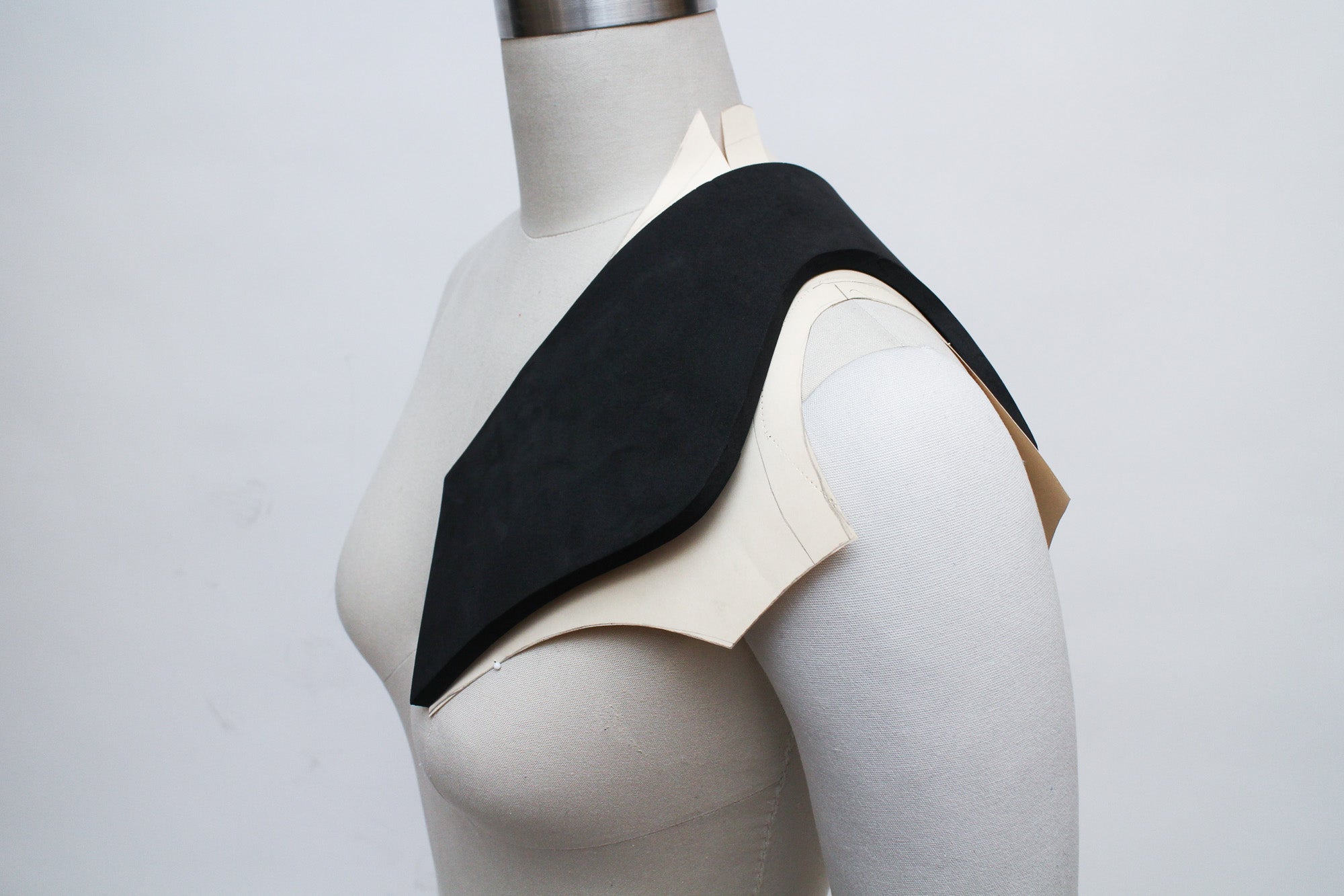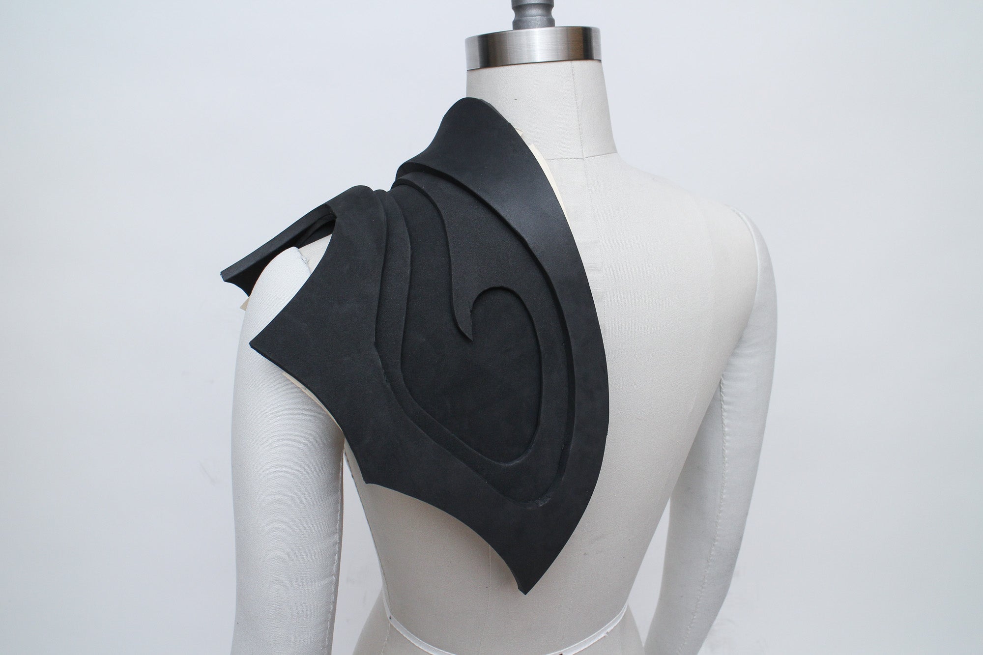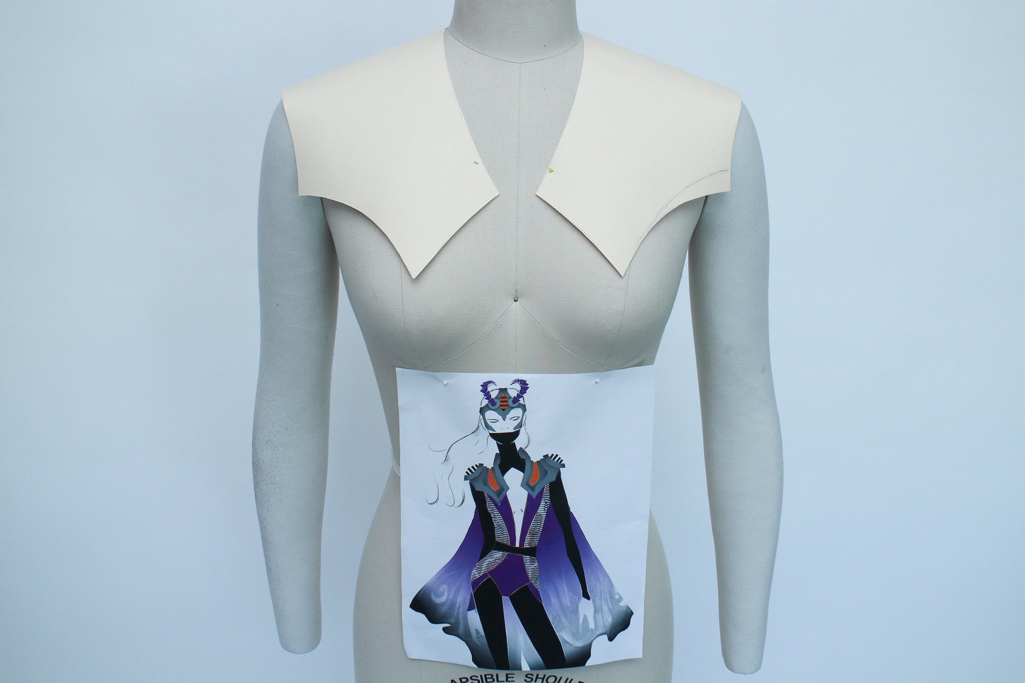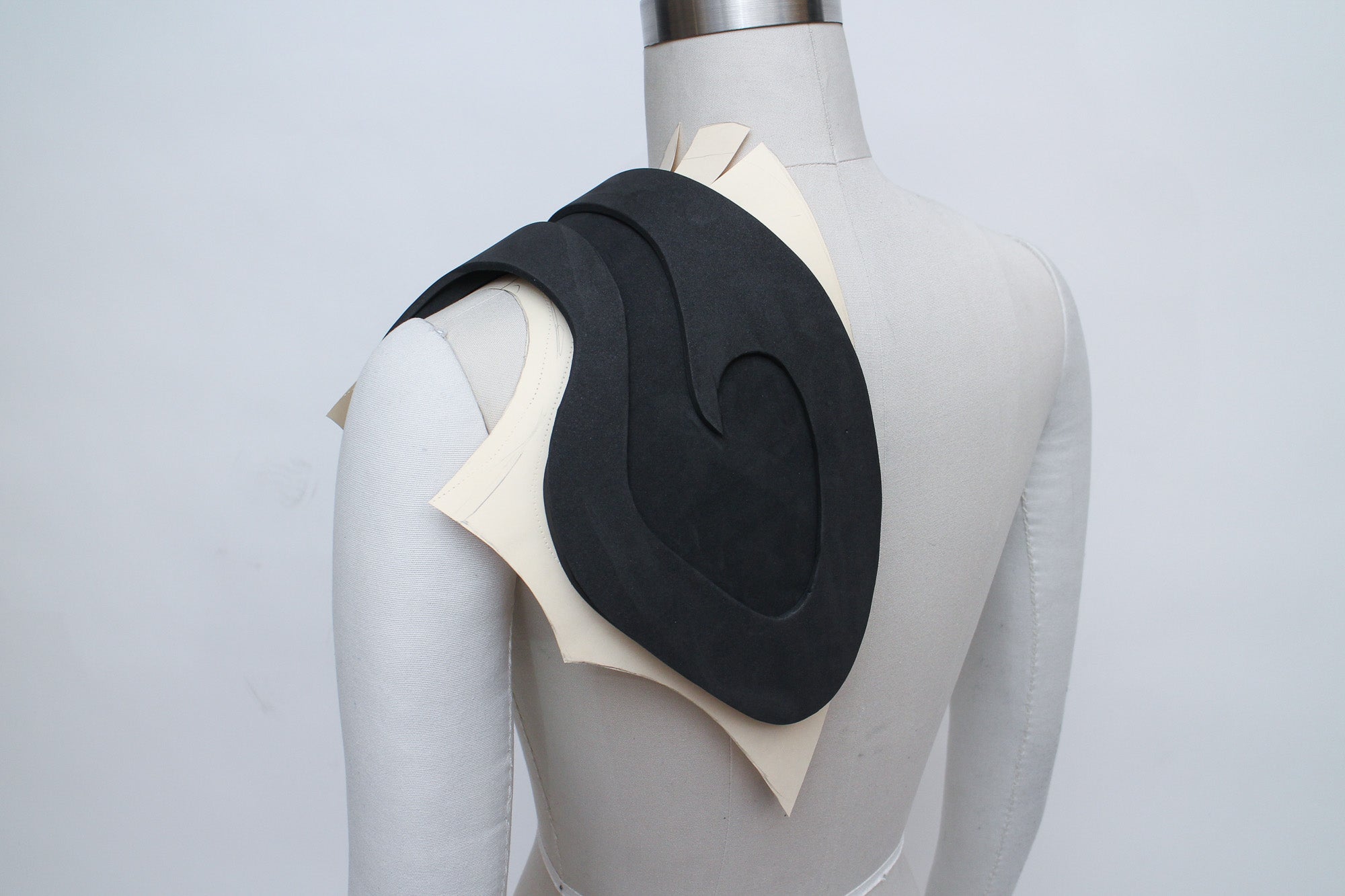 There are many ways to create patterns for EVA foam accessories, and the best methods for patternmaking will vary depending on what kind of accessory you're creating. My go-to patternmaking method for most accessories is to make a mock-up in paper and oak tag (thin cardboard used for pattern drafting) using a dress form and my own body. If you don't have a dress form you can just use yourself, or get a friend to act as your mannequin while you get some basic shapes and proportions.