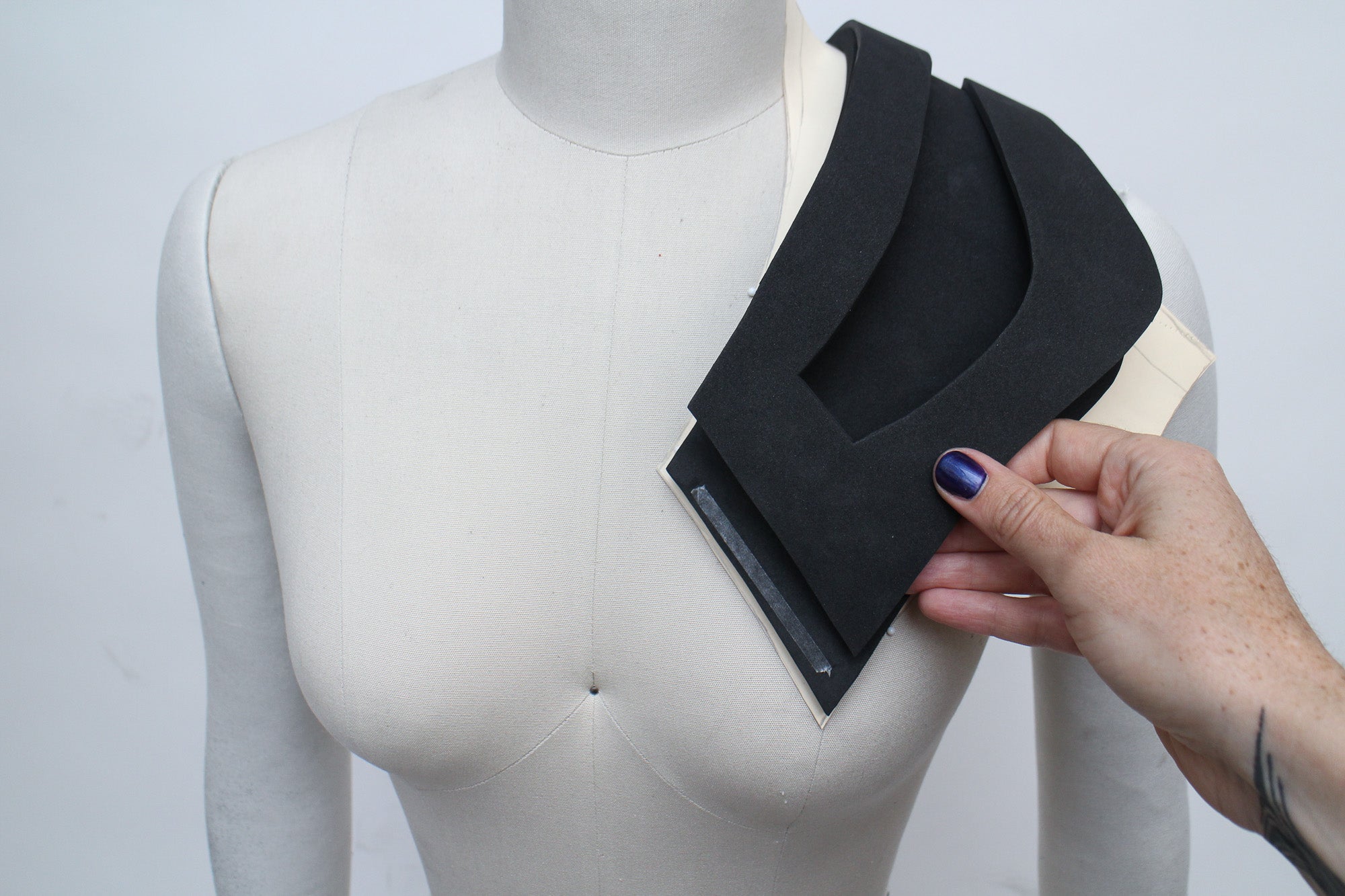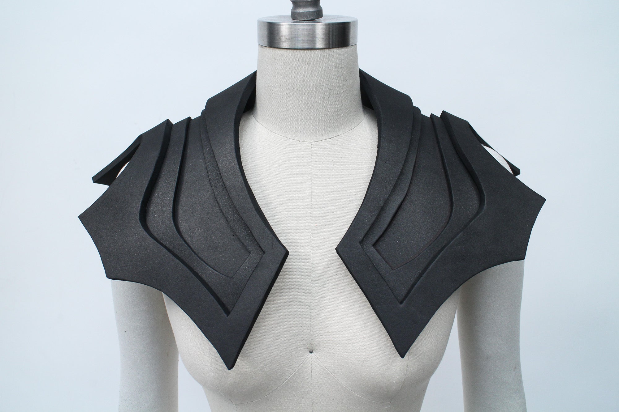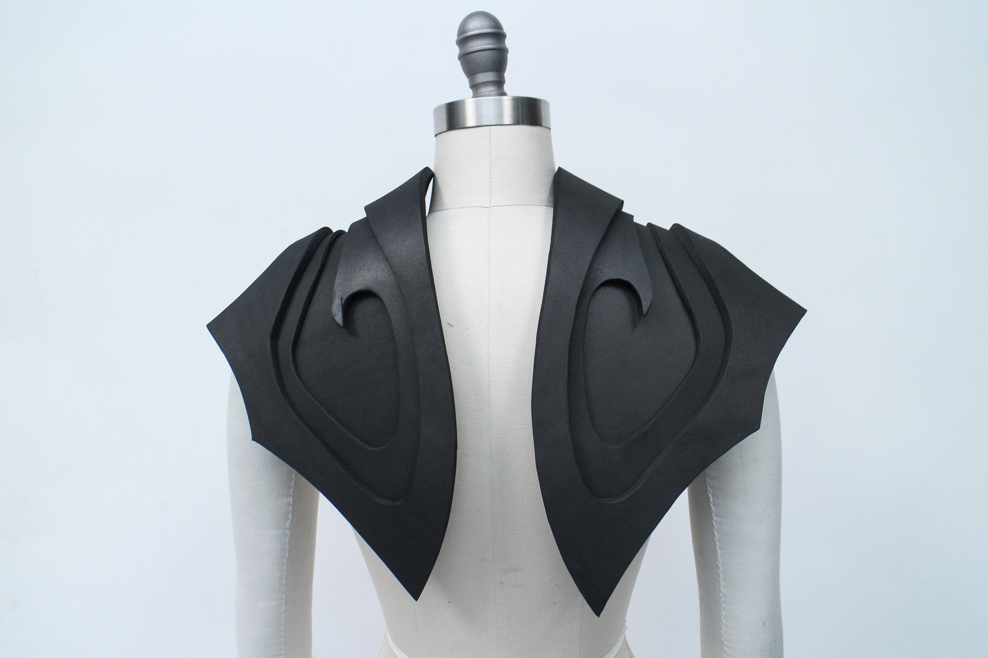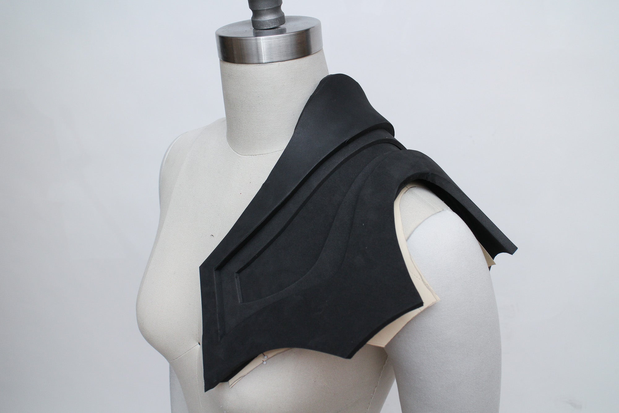 There are many ways to create patterns for EVA foam accessories, and the best methods for patternmaking will vary depending on what kind of accessory you're creating. My go-to patternmaking method for most accessories is to make a mock-up in paper and oak tag (thin cardboard used for pattern drafting) using a dress form and my own body. If you don't have a dress form you can just use yourself, or get a friend to act as your mannequin while you get some basic shapes and proportions.
