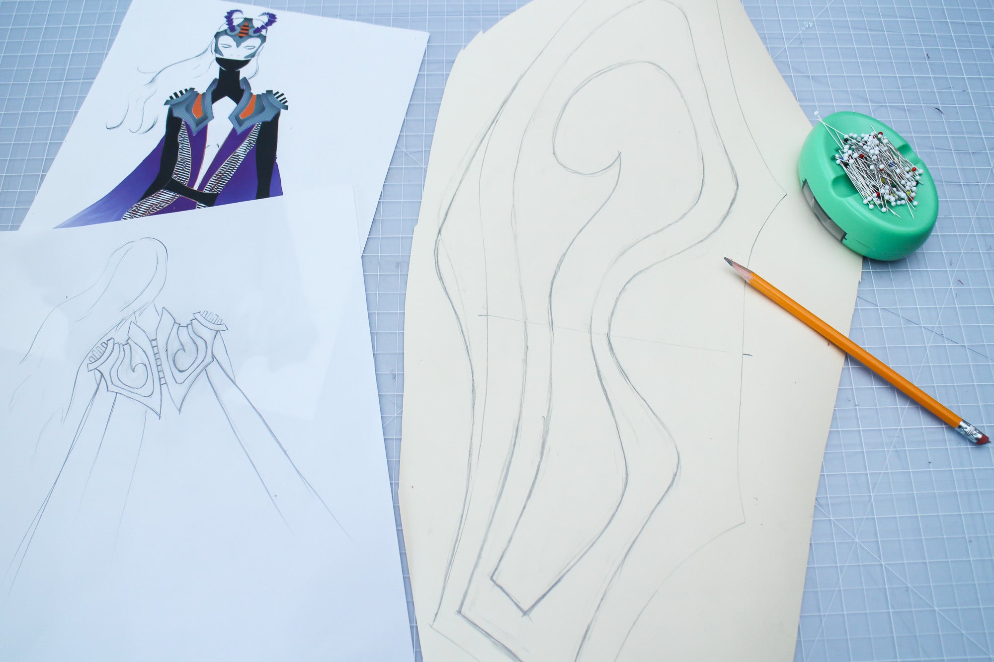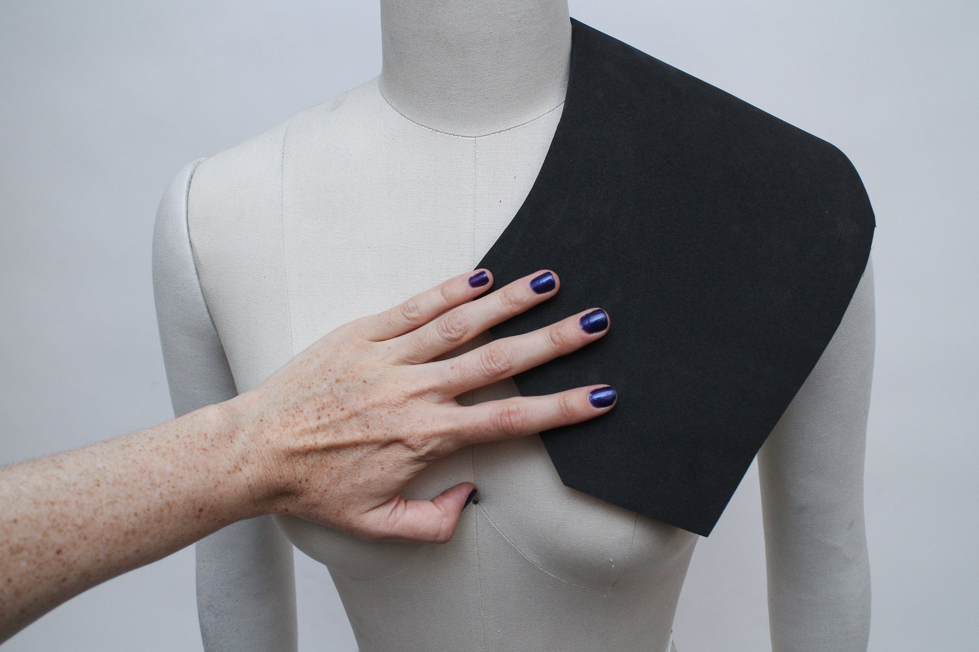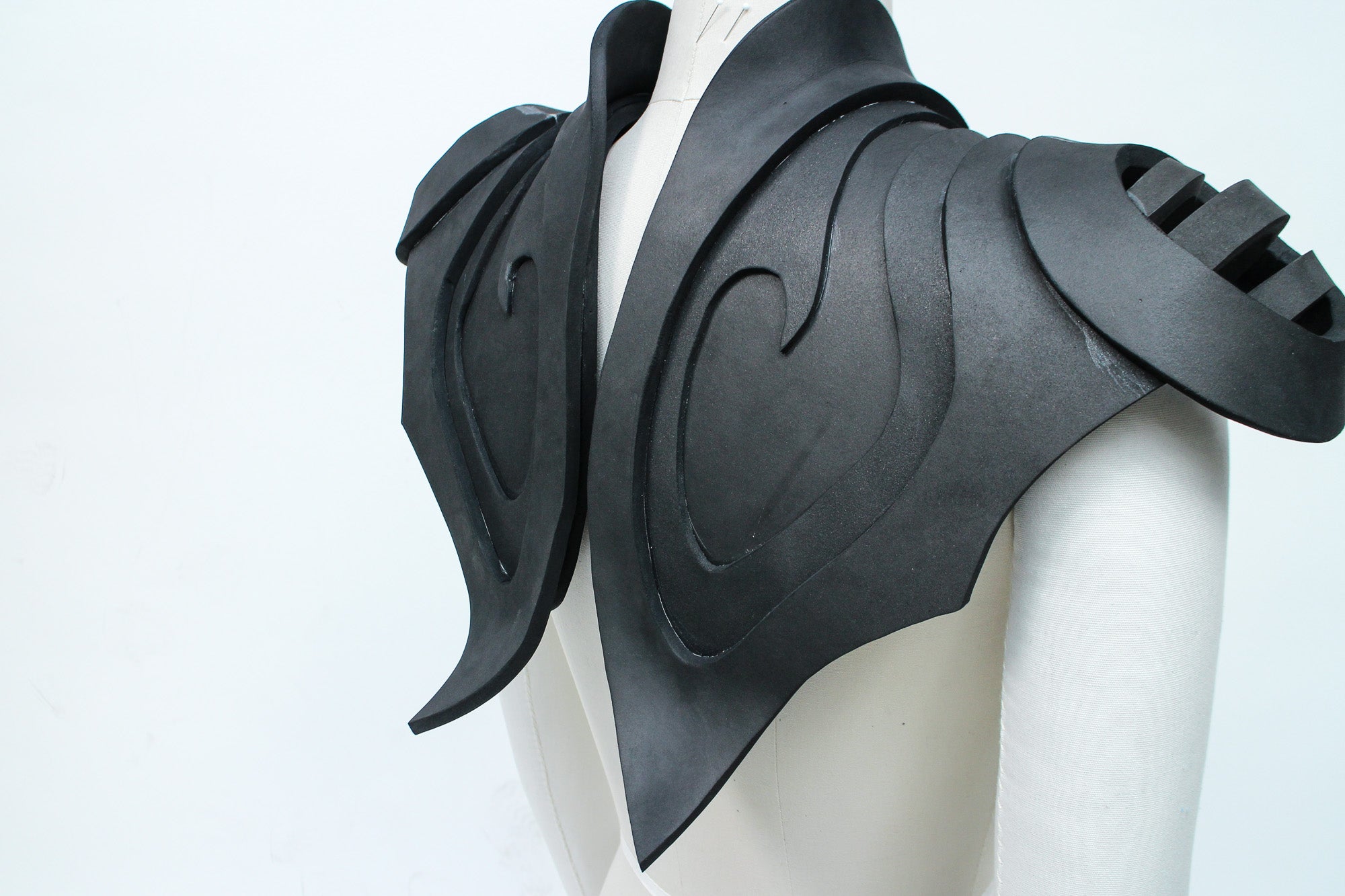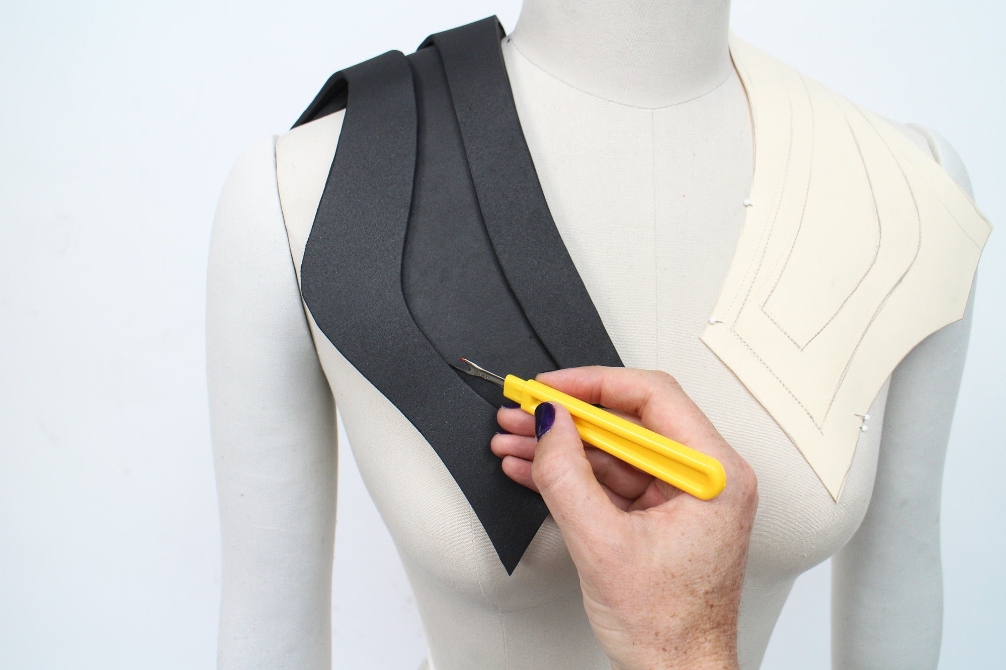 There are many ways to create patterns for EVA foam accessories, and the best methods for patternmaking will vary depending on what kind of accessory you're creating. My go-to patternmaking method for most accessories is to make a mock-up in paper and oak tag (thin cardboard used for pattern drafting) using a dress form and my own body. If you don't have a dress form you can just use yourself, or get a friend to act as your mannequin while you get some basic shapes and proportions.