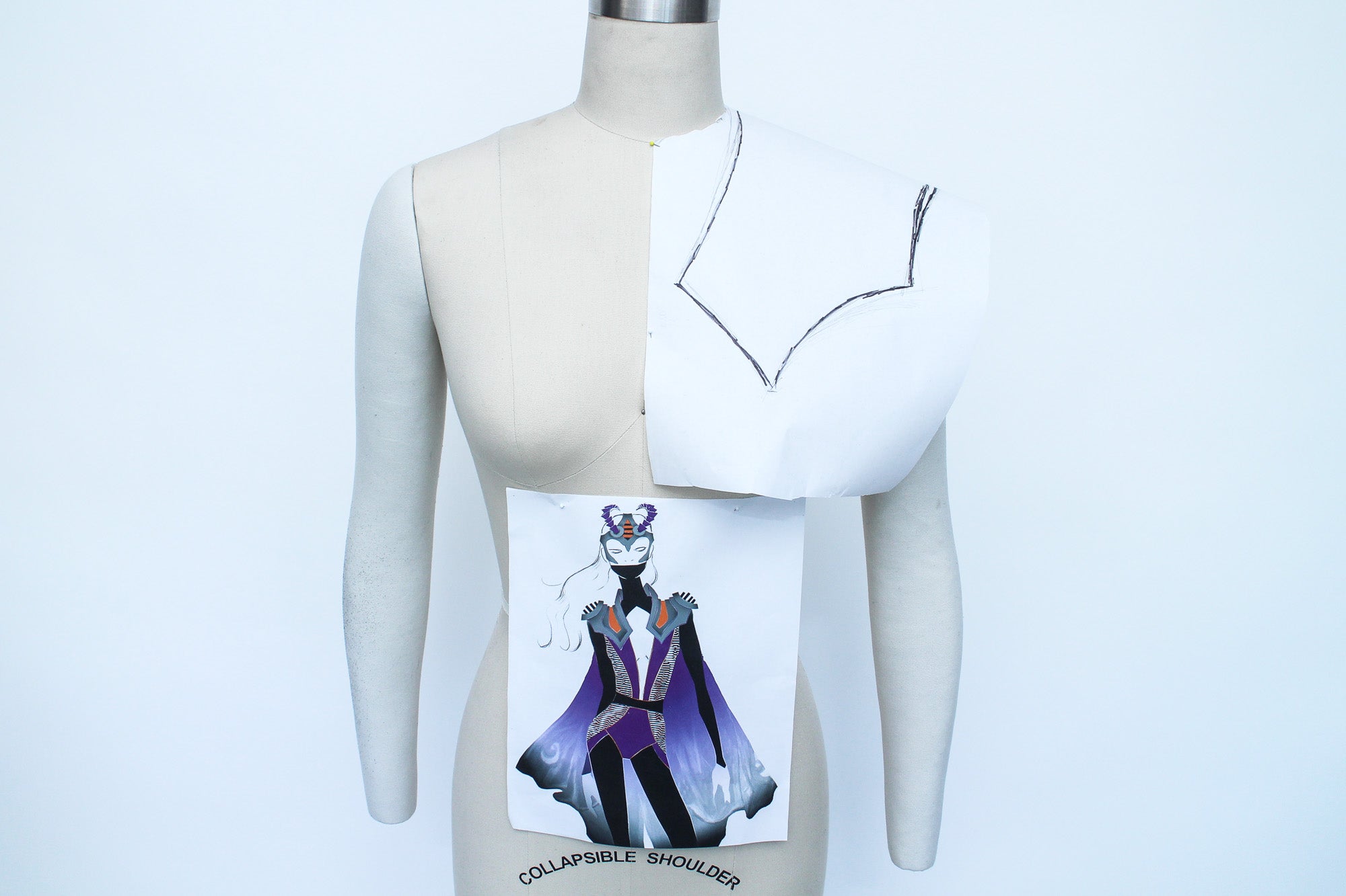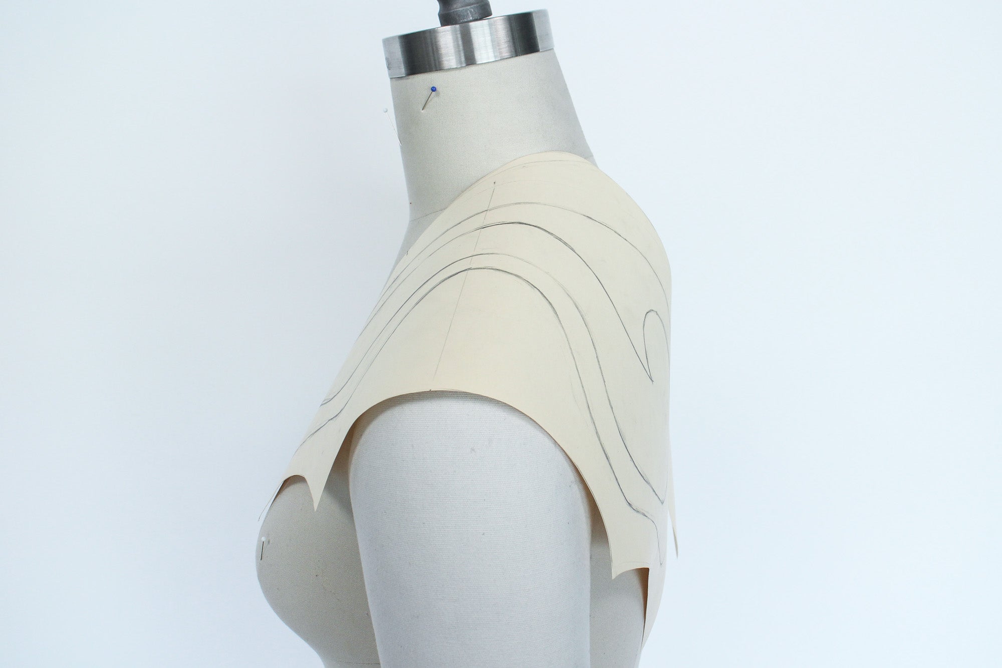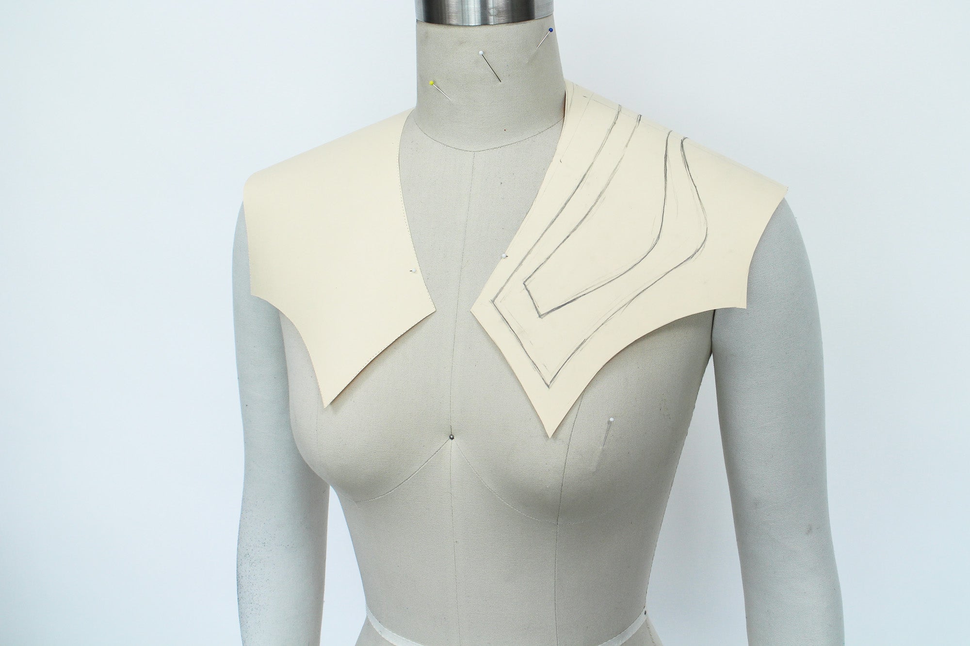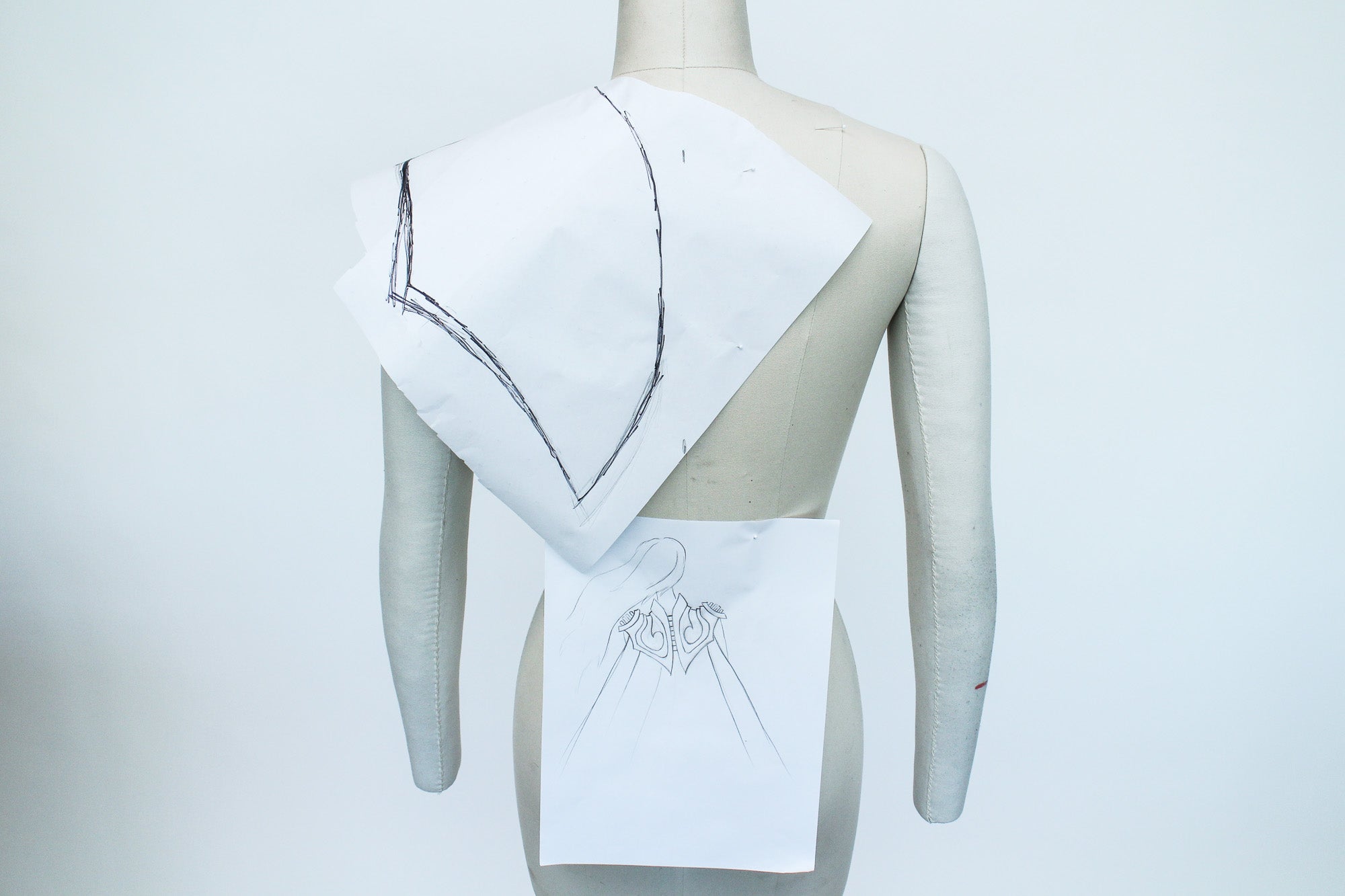 To pattern my shoulder piece I started by pinning a piece of pattern paper to my form and drawing the basic shape of my piece while referring to my sketch, I also marked important points like the shoulder seam.