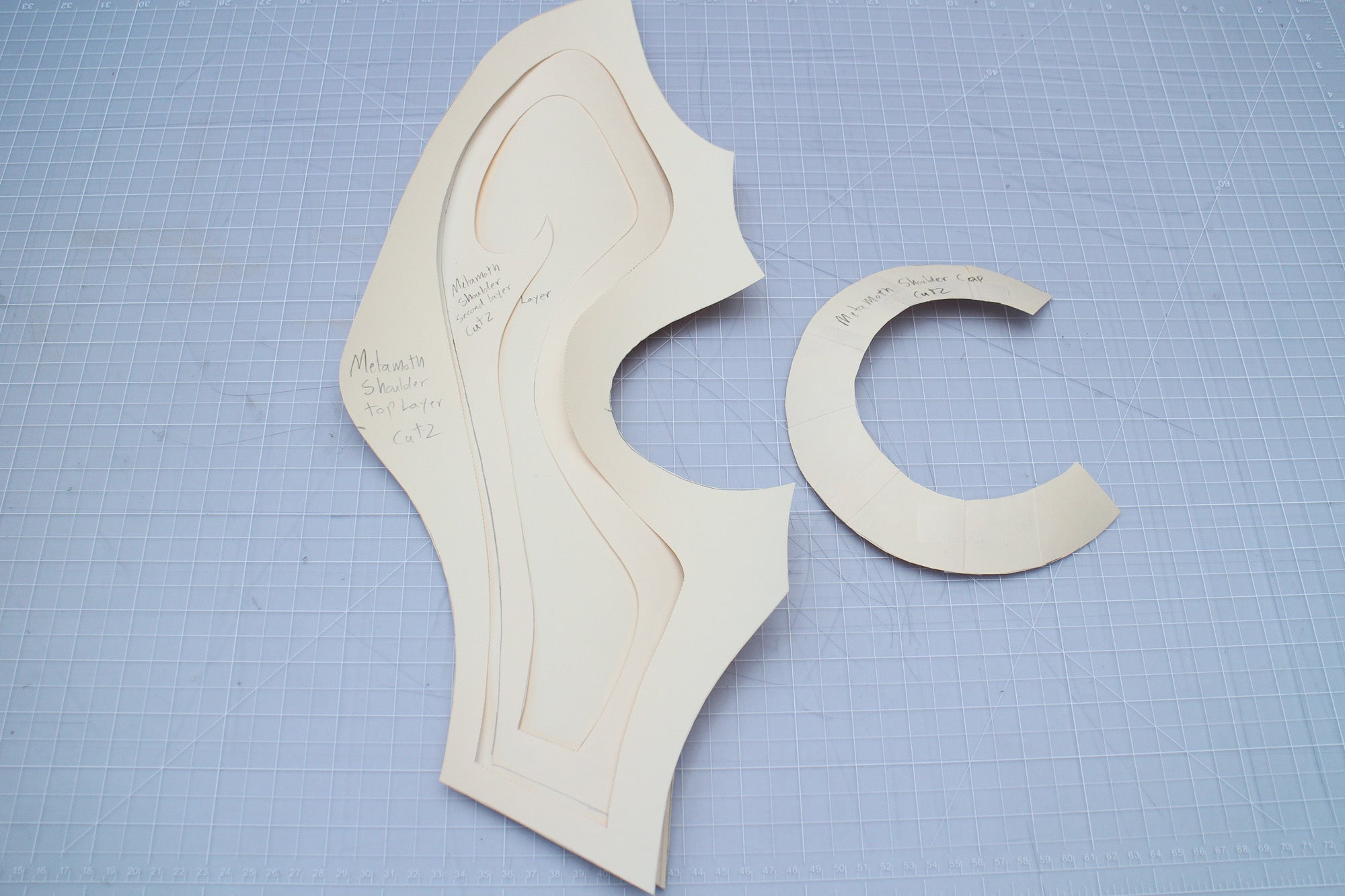 To create costume pieces with both structure and details you'll need to have a few thicknesses on hand. For my shoulder piece I used 8mm and 4mm foam, and for the core of my Worbla headpiece (which we'll talk about in the next lesson) I used 2mm.