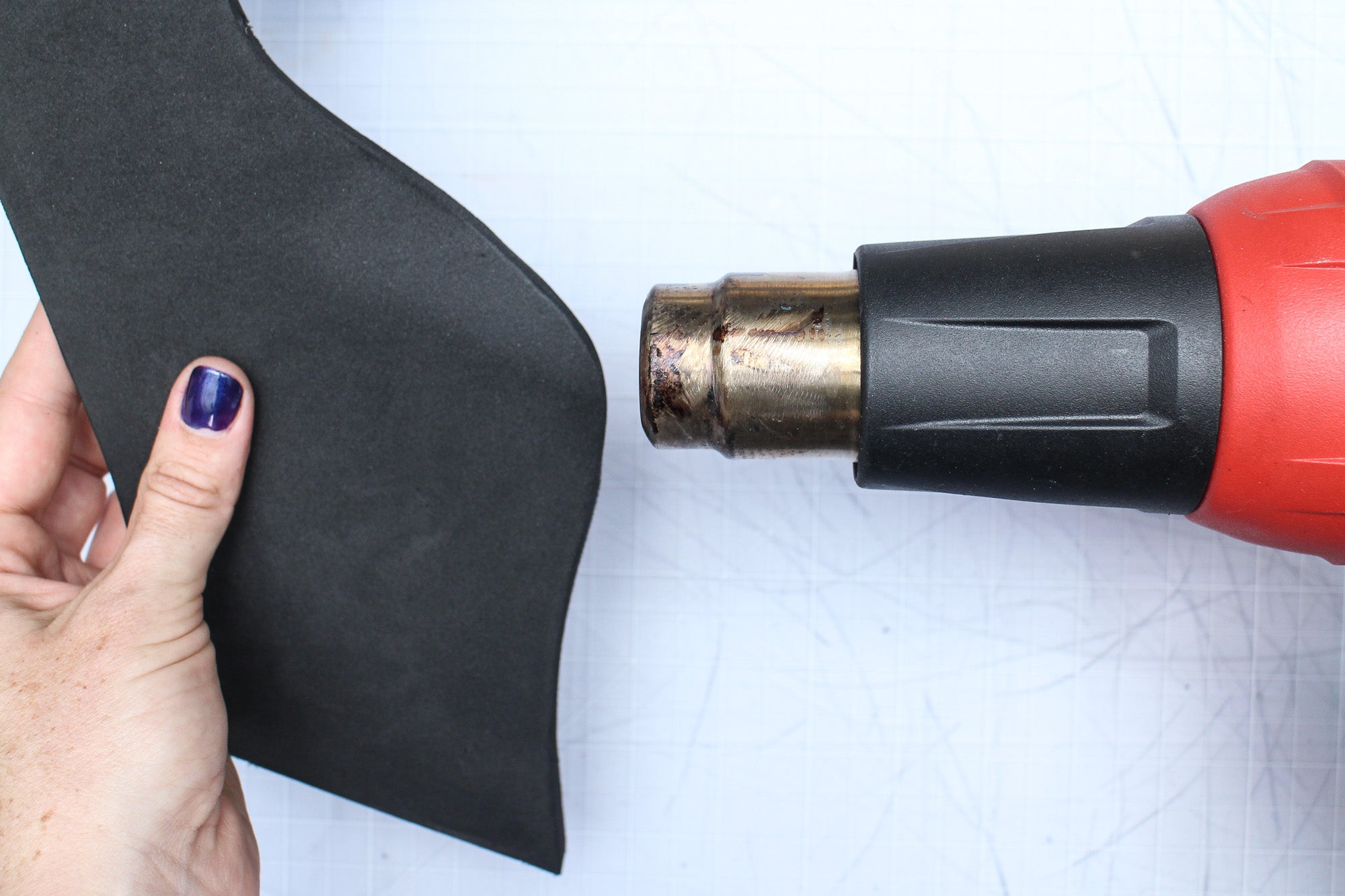 Flip the foam over and use the gun on both sides of the area you want to shape. When you've heated it for about 30 seconds, turn of your gun and try shaping the foam with your hands. Stretch, pull and form it into the shape you want. If it isn't forming enough heat it more and try again, sometimes it takes a few rounds to get a shape you want. Once you've gotten the right shape, try not to heat that area again so you don't undo your work.