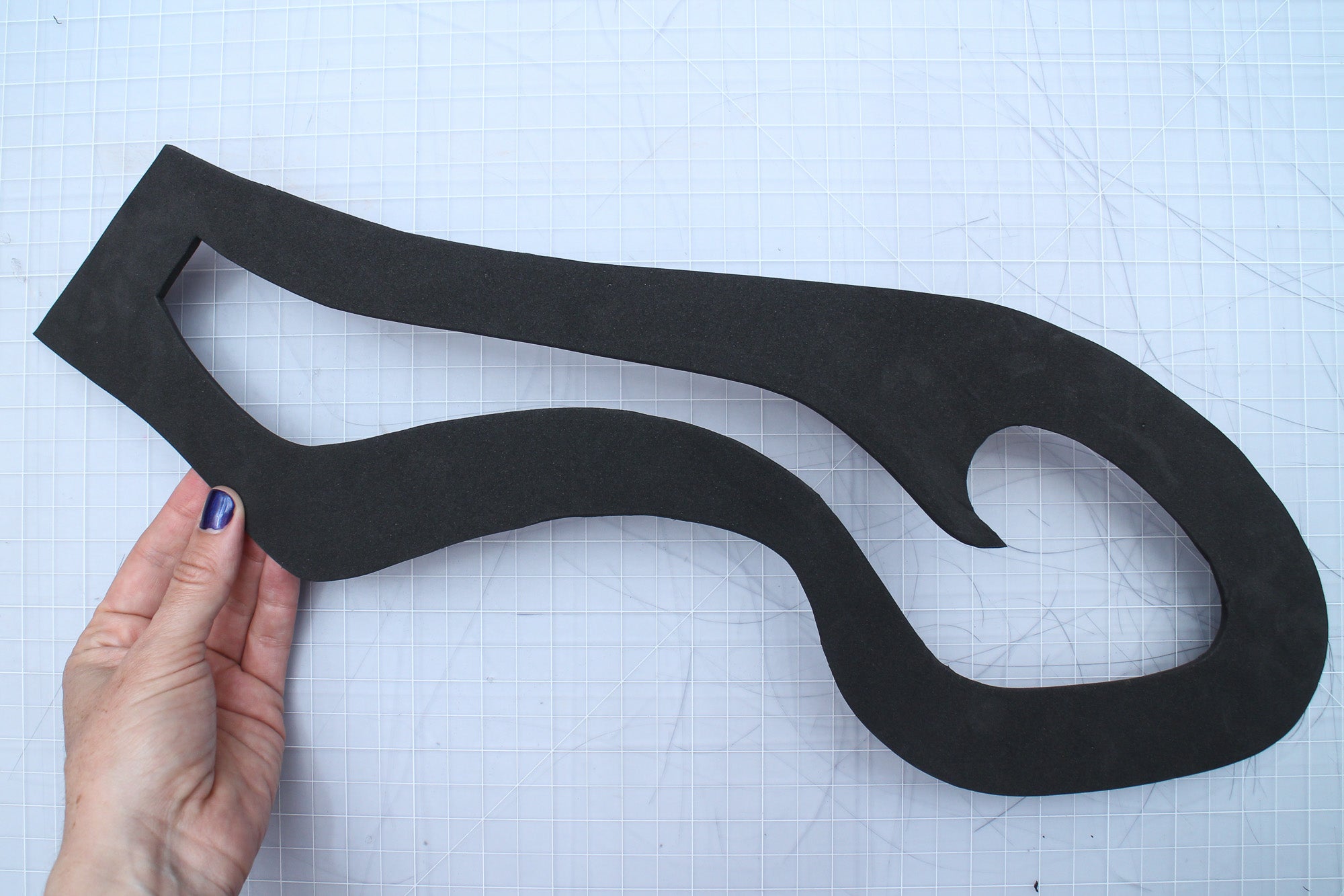 Over a semi-soft cutting surface like a cutting mat or wood cutting block, use a sharp X-acto for craft knife to carefully follow the lines you've traced. Hold the foam down with your other hand as you cut, but be careful not to put your fingers in the way of the blade. No matter what your superpower is, it's always better to have fingers.