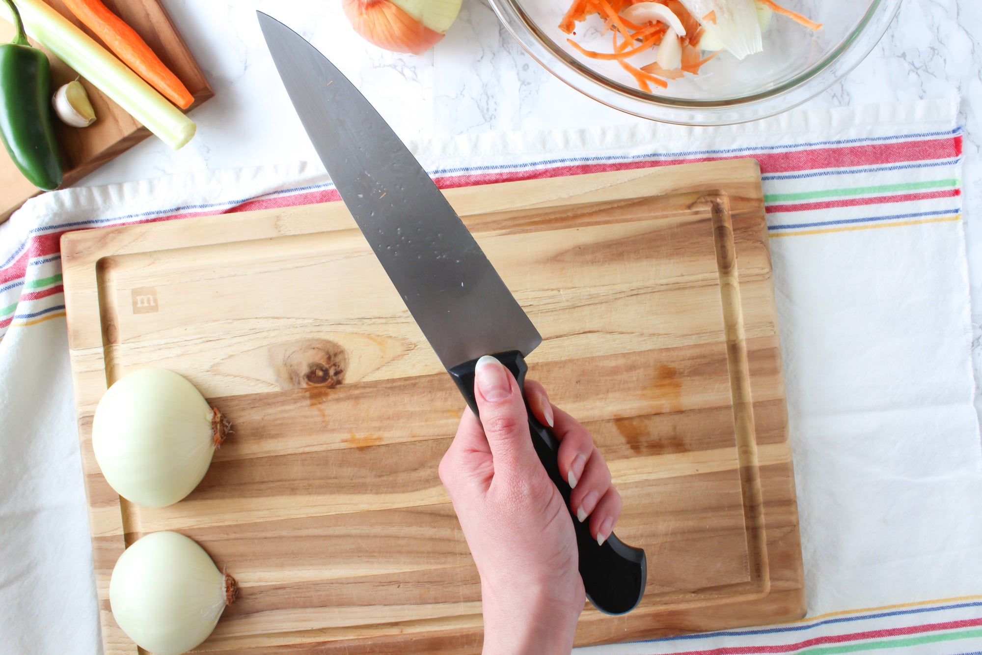 Having a firm, steady grip on your knife is very important. You should always be mindful when cutting and take careful note of where your fingers are.