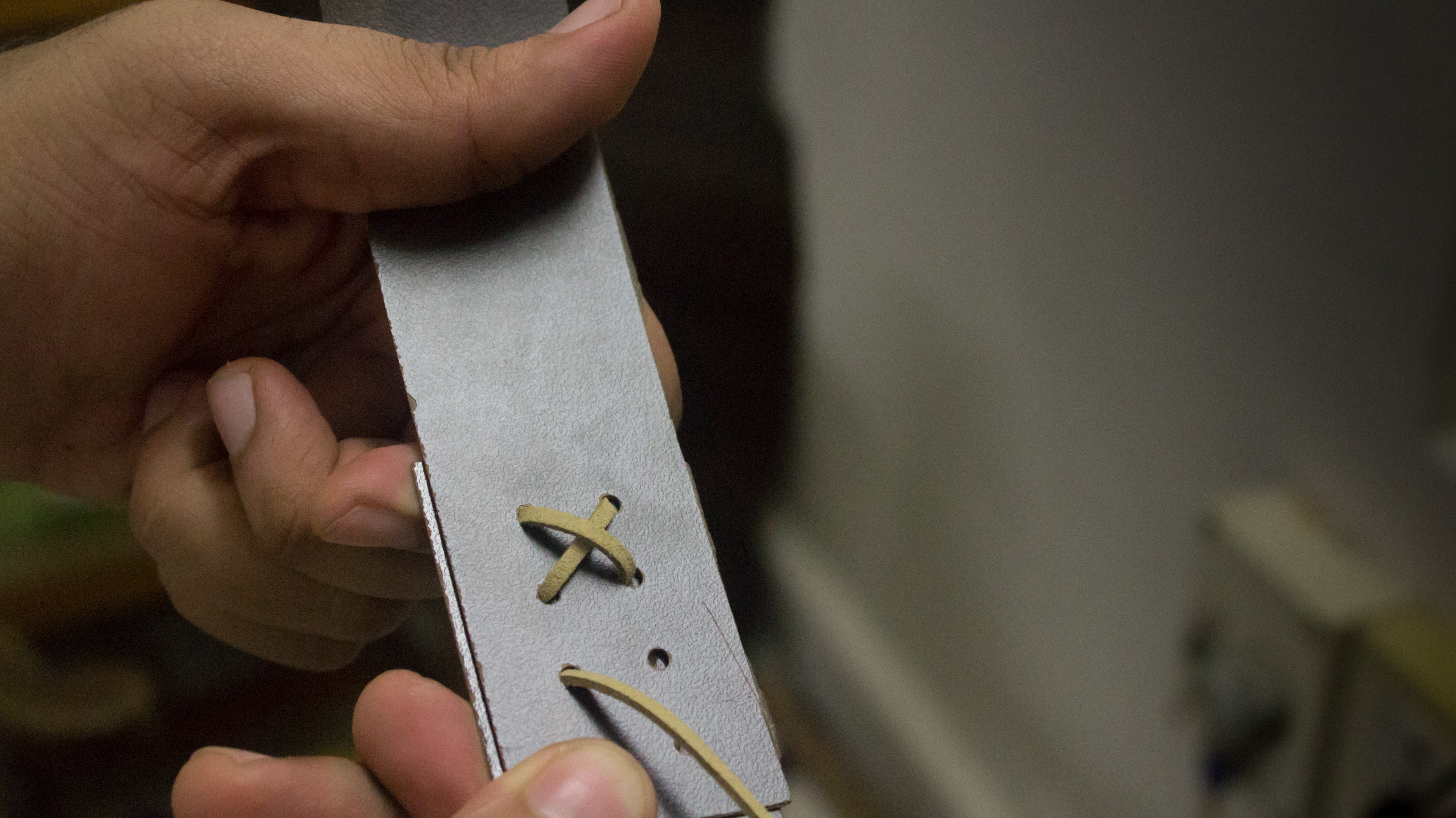 Using the leather string, weave a knot between the holes in order to securely join the two ends of the mica strips. Do this for both of the mica strips which form the two support rings. You will now have two Mica support rings: Outer & Inner Ring with a radius of 52 cm & 40 cm respectively.