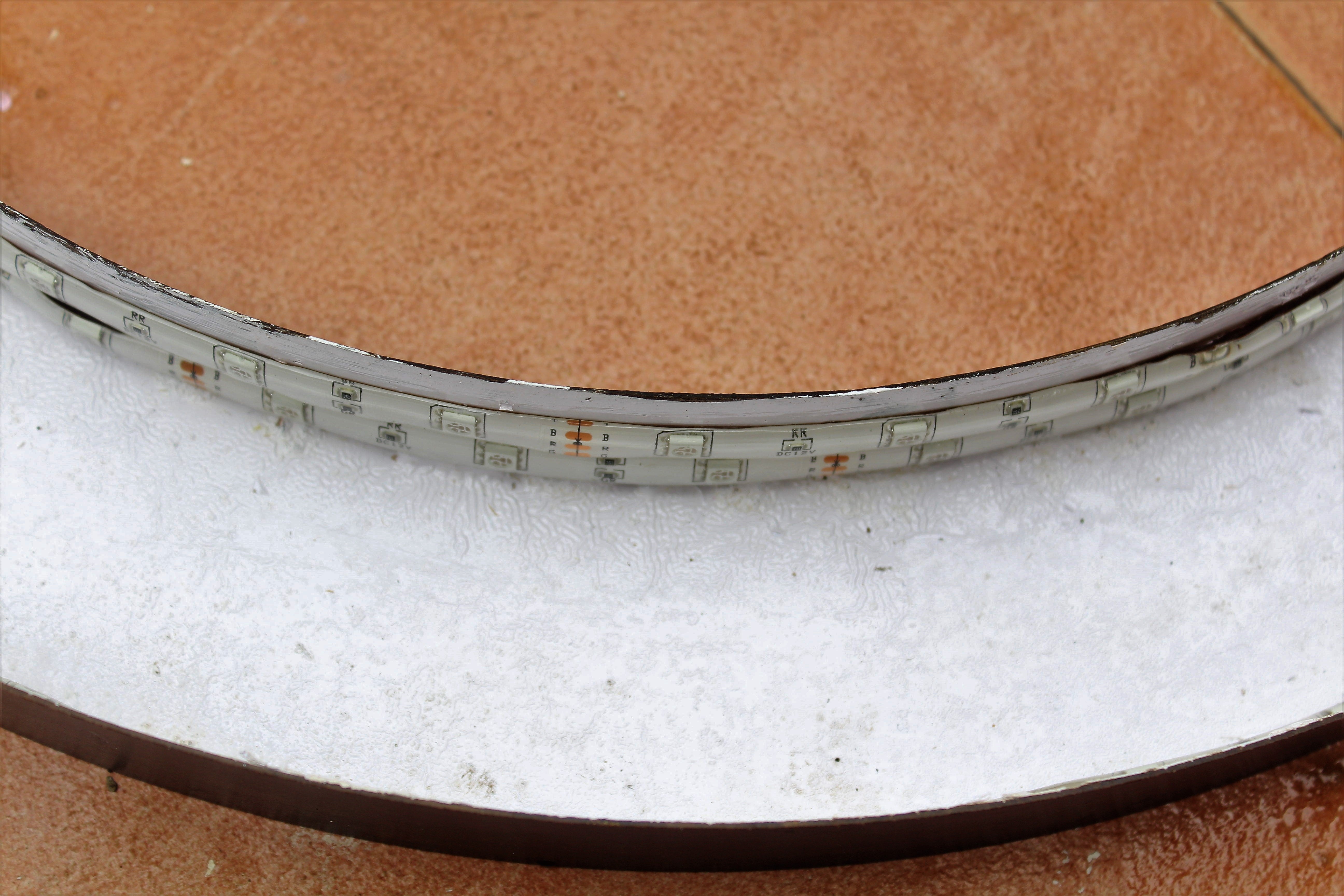 Remove the protective layer from the RGB LED Strip & begin sticking the strip to both support rings. Stick the LED Strip as close to the base as possible. This will ensure that the light is evenly diffused & that individual LED outlines are not visible. Ensure that the 4 wires (Power & Control) are connected to the LED Strip & are routed through the hole made in the MDF Base.