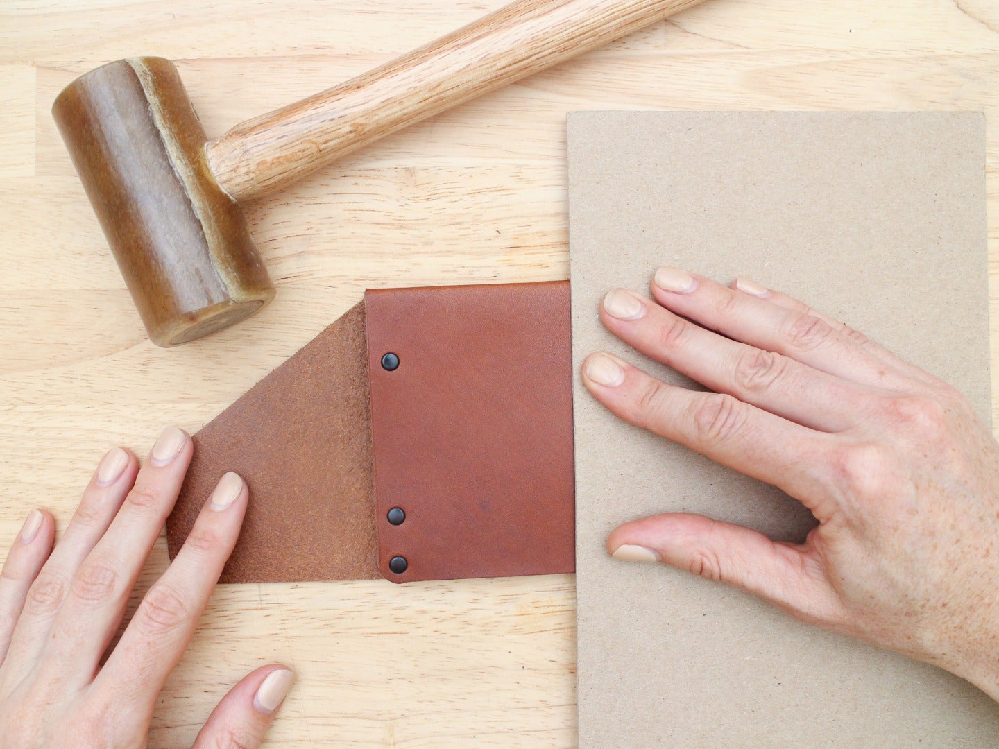 Fold the flap over onto the wallet, lining it up exactly where it should sit and press down hard on the snap with your fingers. When you open the flap, you should be able to see the faint impression of a circle on the leather beneath, this is where the bottom half of your snap should go.