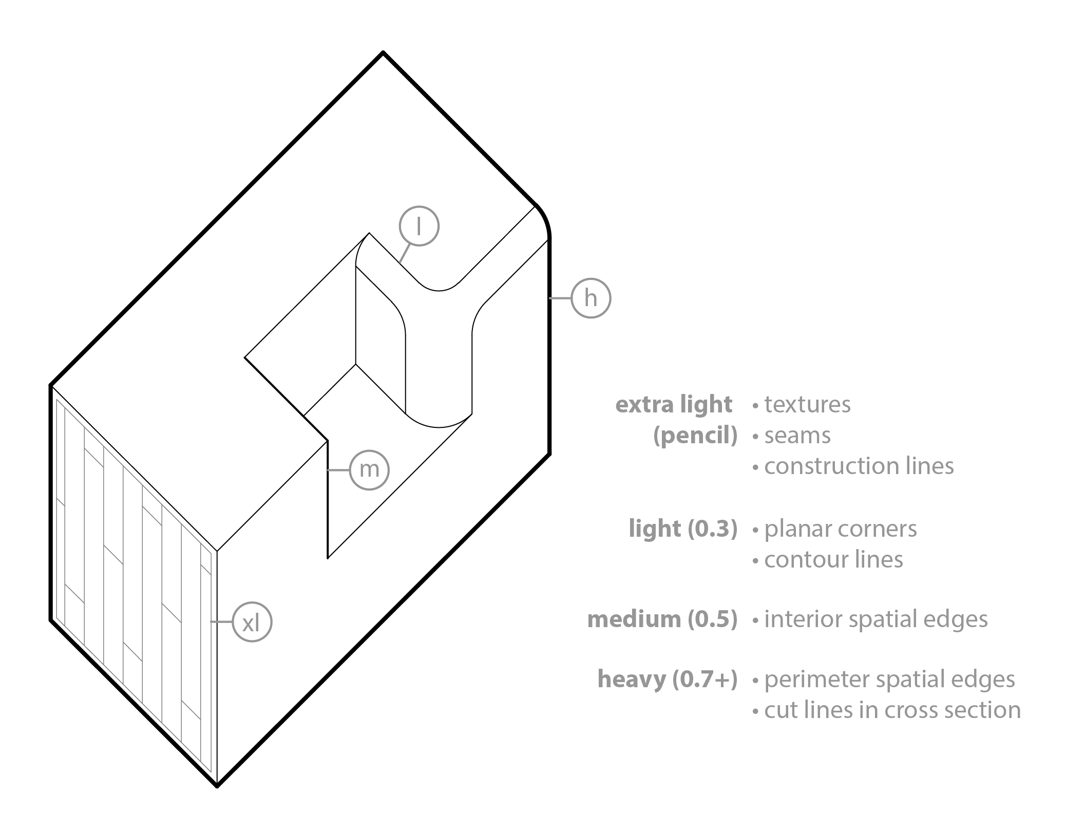 In general, you can think of line weight as a scale from light to heavy based on the depth of the edge you're drawing in relation to what's behind it. In the example above, you'll see that the extra light lines (the pattern on the side) are for an edge that has essentially zero depth to the surface behind it. The light lines have a greater difference between the depth between the edge and the surface behind it because the surfaces are angled away from or towards each other. The medium lines have a greater depth between the edges and the surface behind them because the only surface behind that we can see in the view are the ones on the indentation. The heavy lines are reserved for the edges with the most depth (there's nothing behind them).