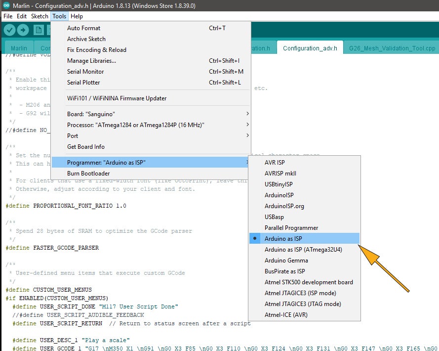 Then, with the ArduinoISP sketch uploaded to the Arduino Uno, open up the Musical Marlin firmware.
