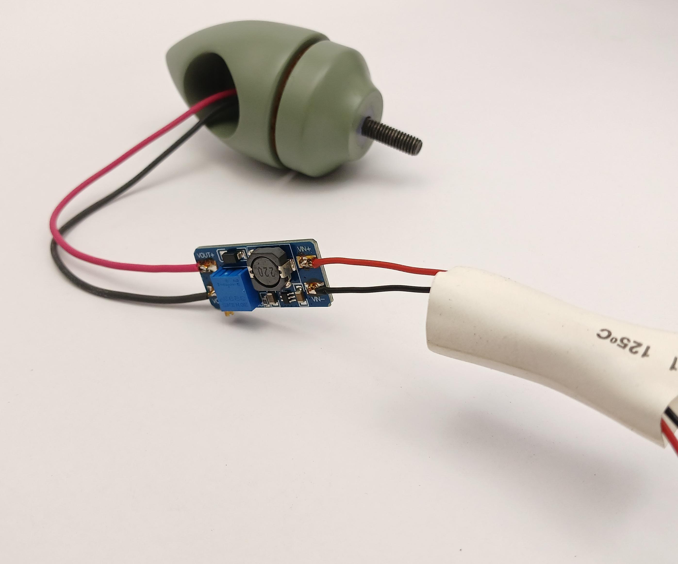 After verifying the voltage I soldered on the fan to the output of the module and insulated the module inside of a heat shrink tube.