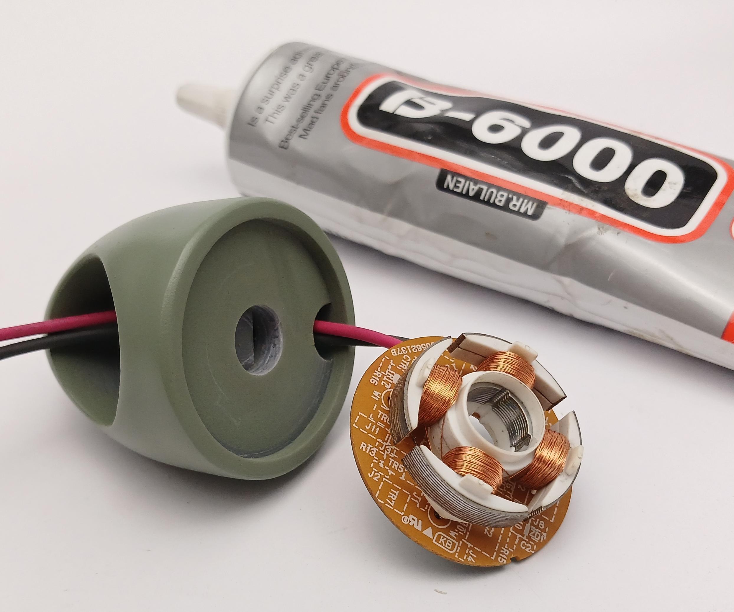 Now we move on to the stator, I fed the power wires through the top and down the stand hole in the printed housing as pictured and then using the same B-6000 adhesive I glued the stator board into it's slot making sure it is level with the housing.