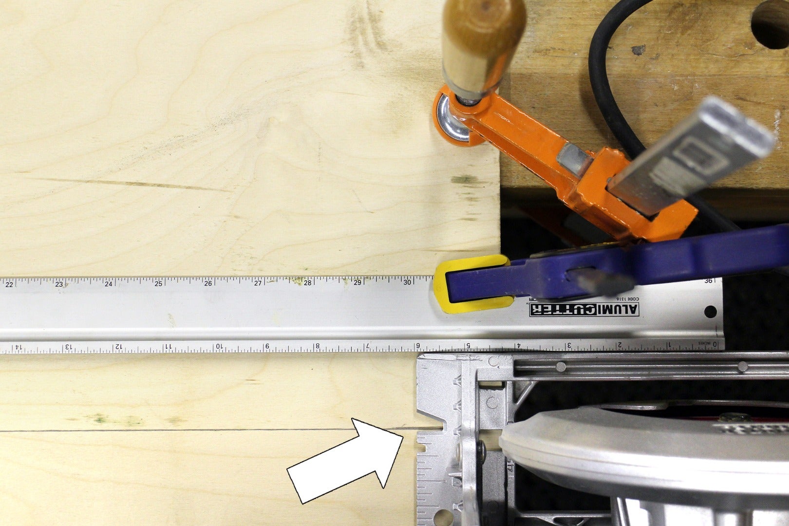 You can make a cut without any guides by carefully following the line with your cut notch on your circular saw, but an easy way to get perfectly straight cuts it to set up a fence. A fence is a straight member used to guide the plate of the circular saw. Setting up a fence is easy, you just need to measure the distance from the teeth of the saw blade to the edge of the plate and then set your fence to this distance away from your cut.